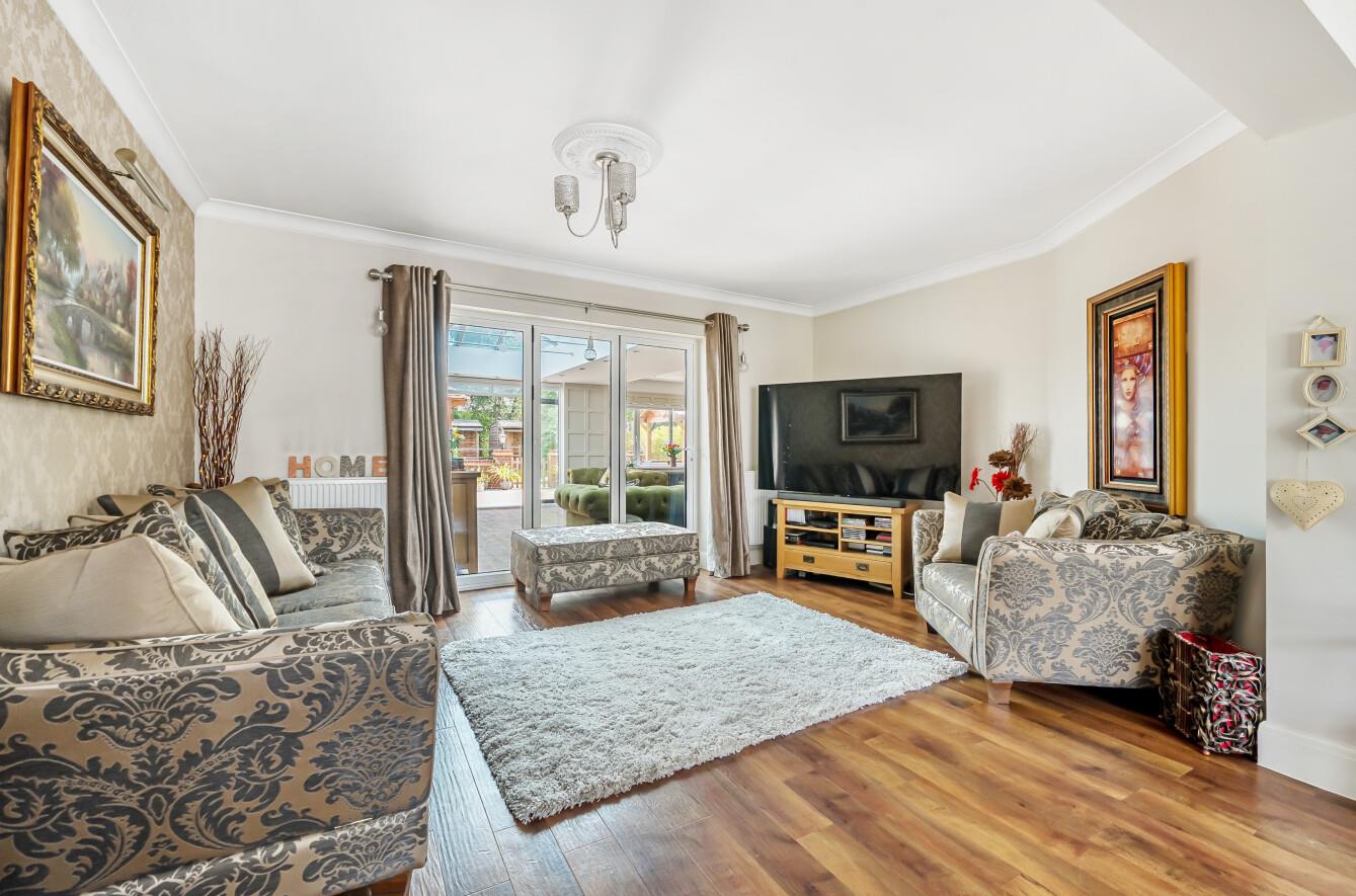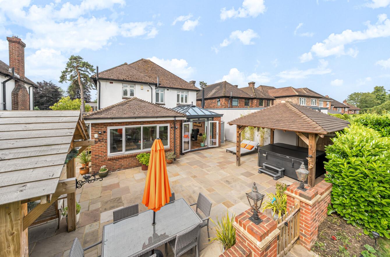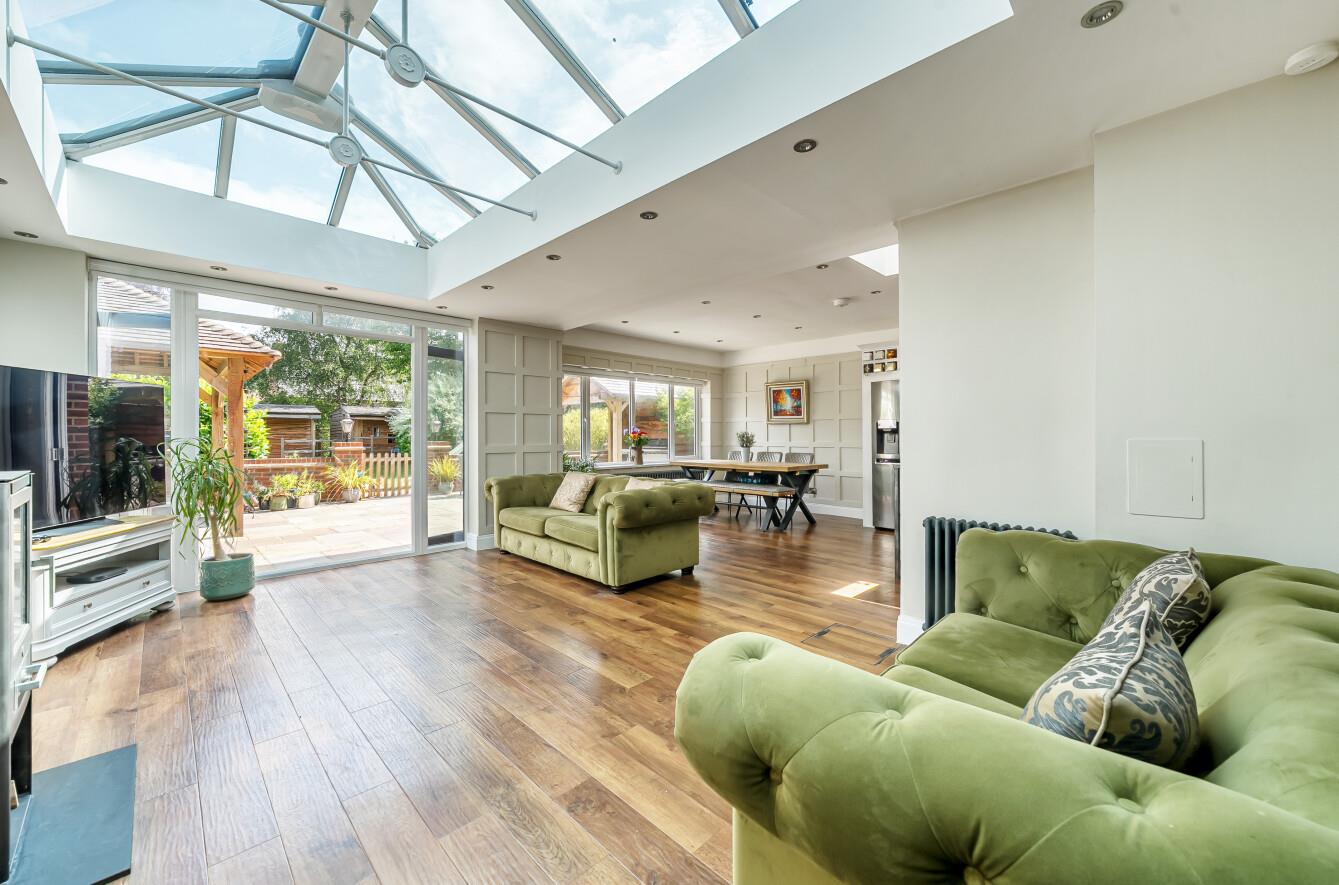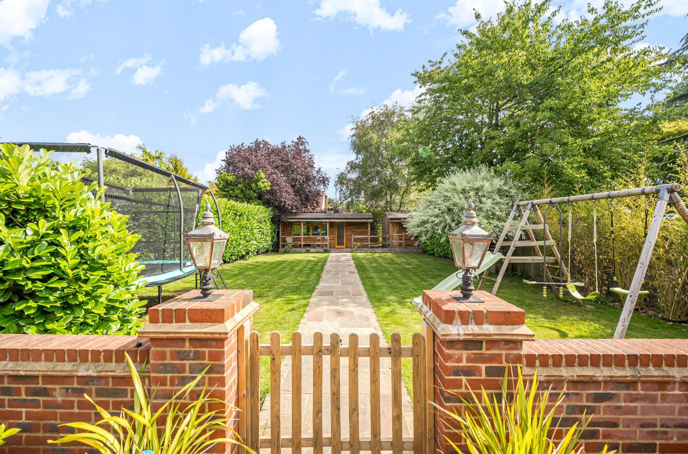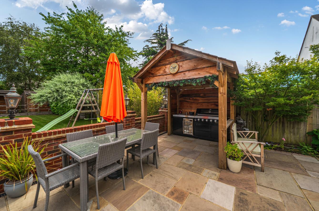 £900,000 - £950,000 Guide Price. Beautifully presented four/ five bedroom detached residence. Stylish fitted kitchen with separate utility room. Seamless open-plan spaces - Four receptions, Play room, Office. Elegant contemporary interiors - Log burner - Inspired roof lantern. Luxurious en-suite and family bathroom. Indoor and outdoor office space/ gym/ cinema room. Impressively large garden - Oak- Framed pavilions - Substantial cabin - Childs play house. Close to highly regarded schooling options. Convenient access to road and rail networks.