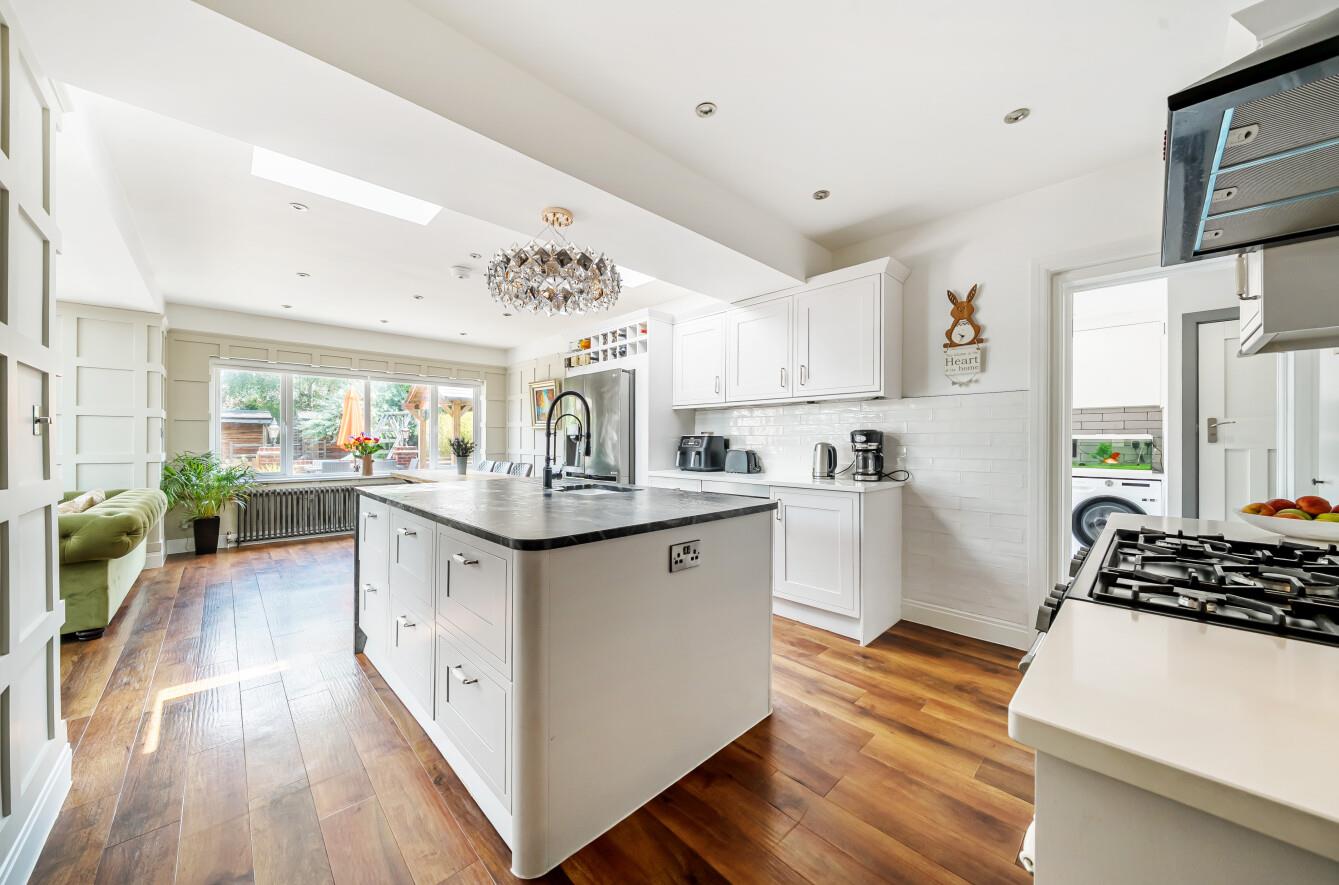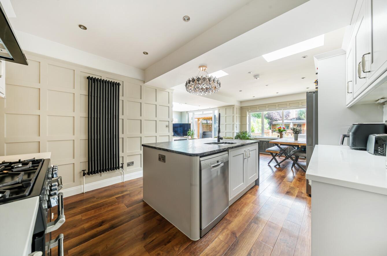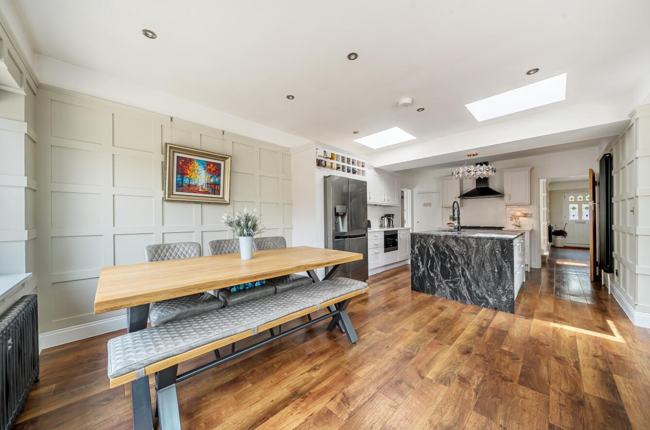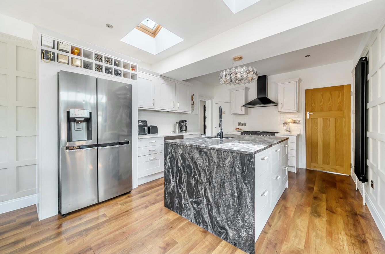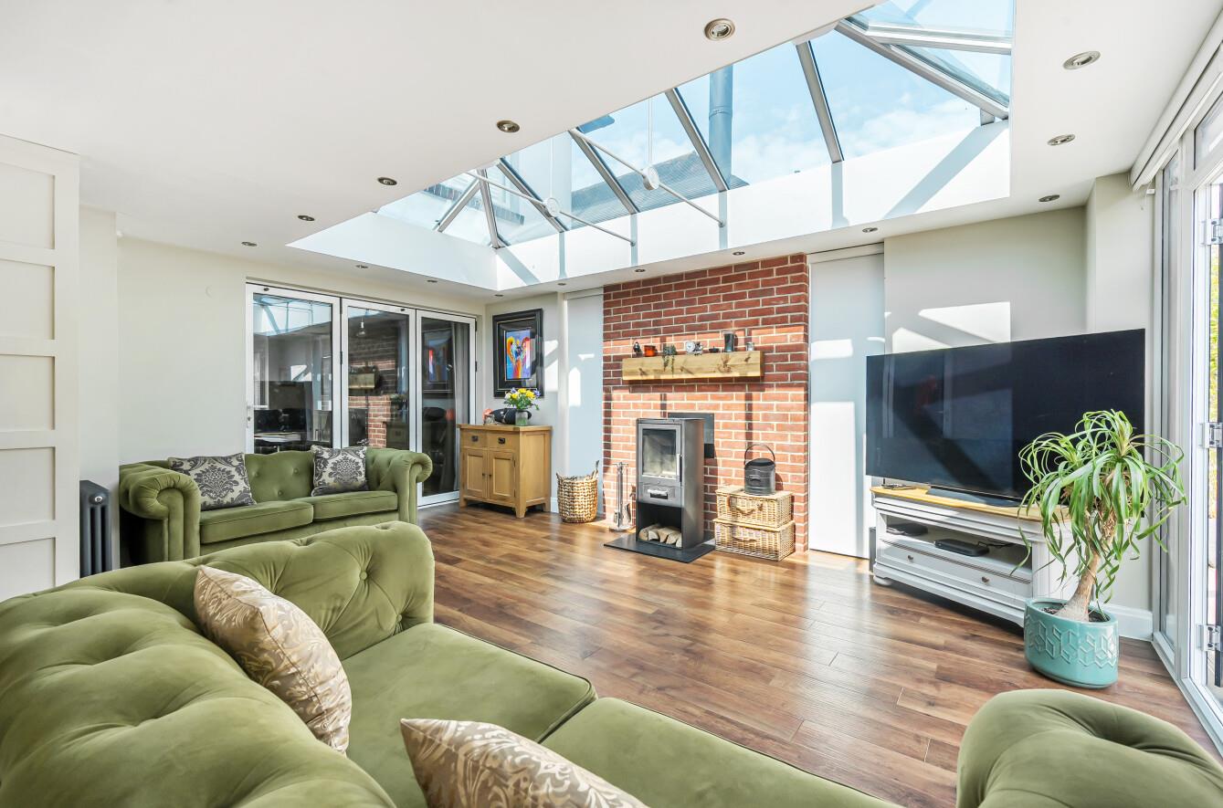 Step inside and you are welcomed by an invitingly generous hallway, setting the tone for the sense of space and comfort that defines this exceptional home. At its heart lies a beautifully hand-crafted contemporary kitchen, where marble and granite work surfaces combine with high-specification appliances to deliver a kitchen as practical as it is elegant. The kitchen flows effortlessly into the dining area and on to an informal lounge, where French doors open onto the outdoor living space. A striking roof lantern fills this area with light by day, while a log-burning stove brings cosy warmth by night, perfect for relaxed family living.