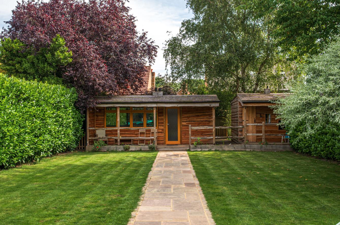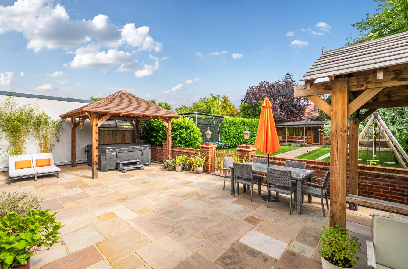 Outside, Westwell continues to impress with its beautifully landscaped formal garden. A large wrap-around Indian sandstone terrace provides dedicated areas for an outdoor kitchen and hot tub, each sheltered beneath attractive oak-framed pavilions, creating the ultimate space for outdoor living and entertaining. A quaint wooden gate opens onto an expansive lawn, an ideal playground for children, while a path leads to a charming timber-clad cabin, currently used as a home office but equally suited to serve as a gym, games room or home cinema. The cabin's pretty veranda offers an idyllic spot to relax and unwind, while a separate, beautifully crafted children's cabin promises hours of fun. A large garden shed provides additional, practical storage.