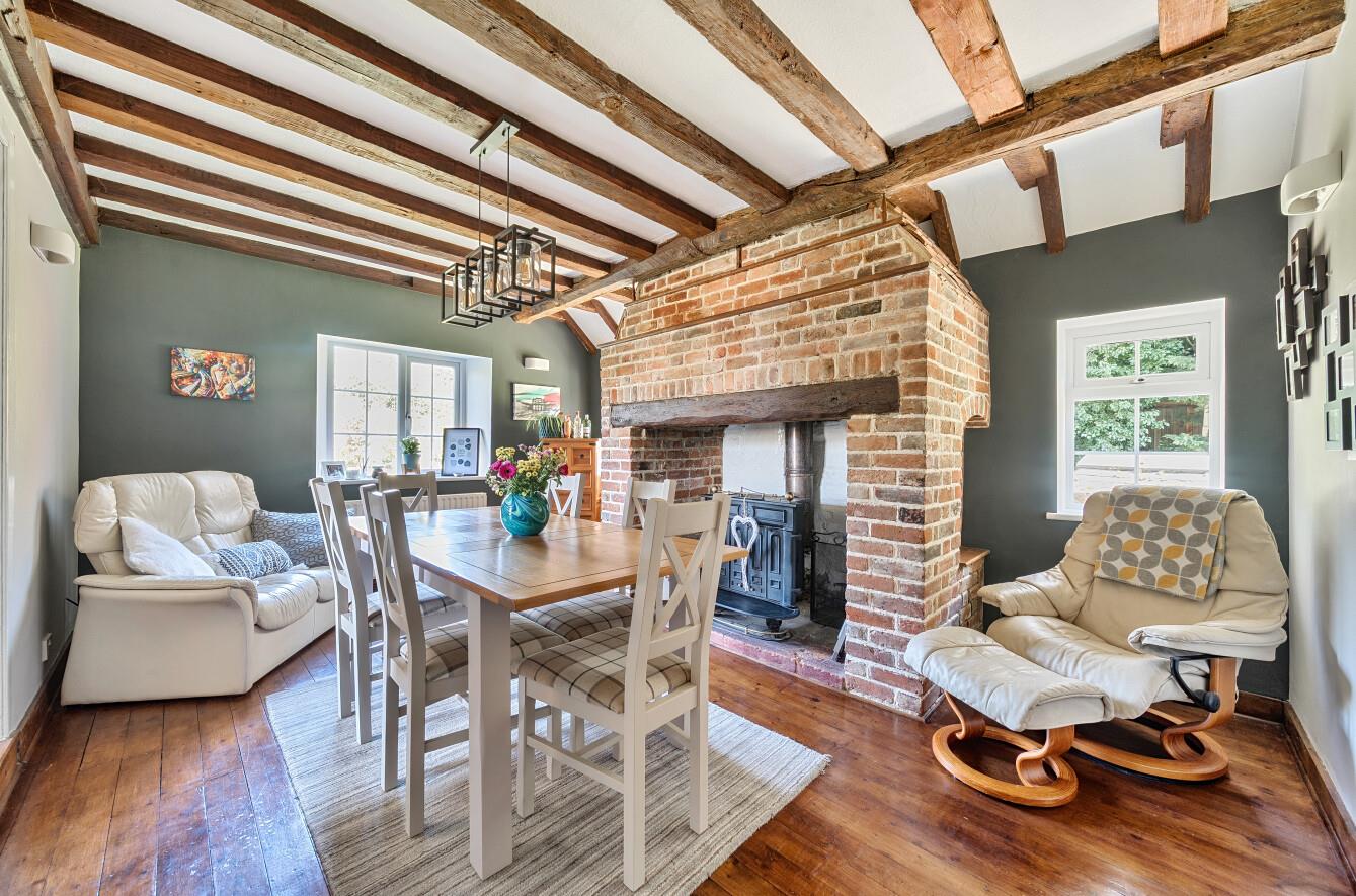 To the rear of the home, a stunning dining room makes a bold impression with its exposed beams and large inglenook fireplace, flowing effortlessly into a country-style kitchen/breakfast room. French doors open directly onto a generous terrace, offering seamless integration between indoor and outdoor living, perfect for al fresco gatherings on warm summer days.