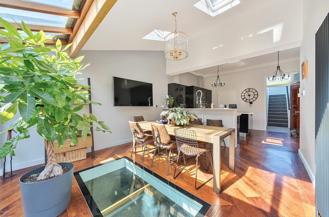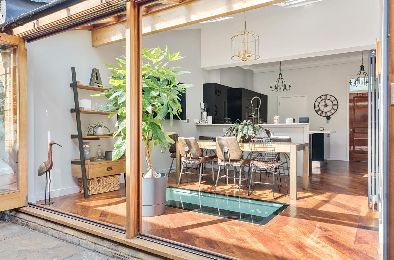 The ground floor unfolds with the kitchen and sunroom, the true heart of the home. Light pours into the space, highlighting a stylish open-plan layout with an informal dining area. A glass floor viewing window offers a glimpse into the leisure complex below, while wide aperture doors connect effortlessly to the courtyard garden, creating the perfect setting for al fresco dining and seamless indoor-outdoor entertaining.