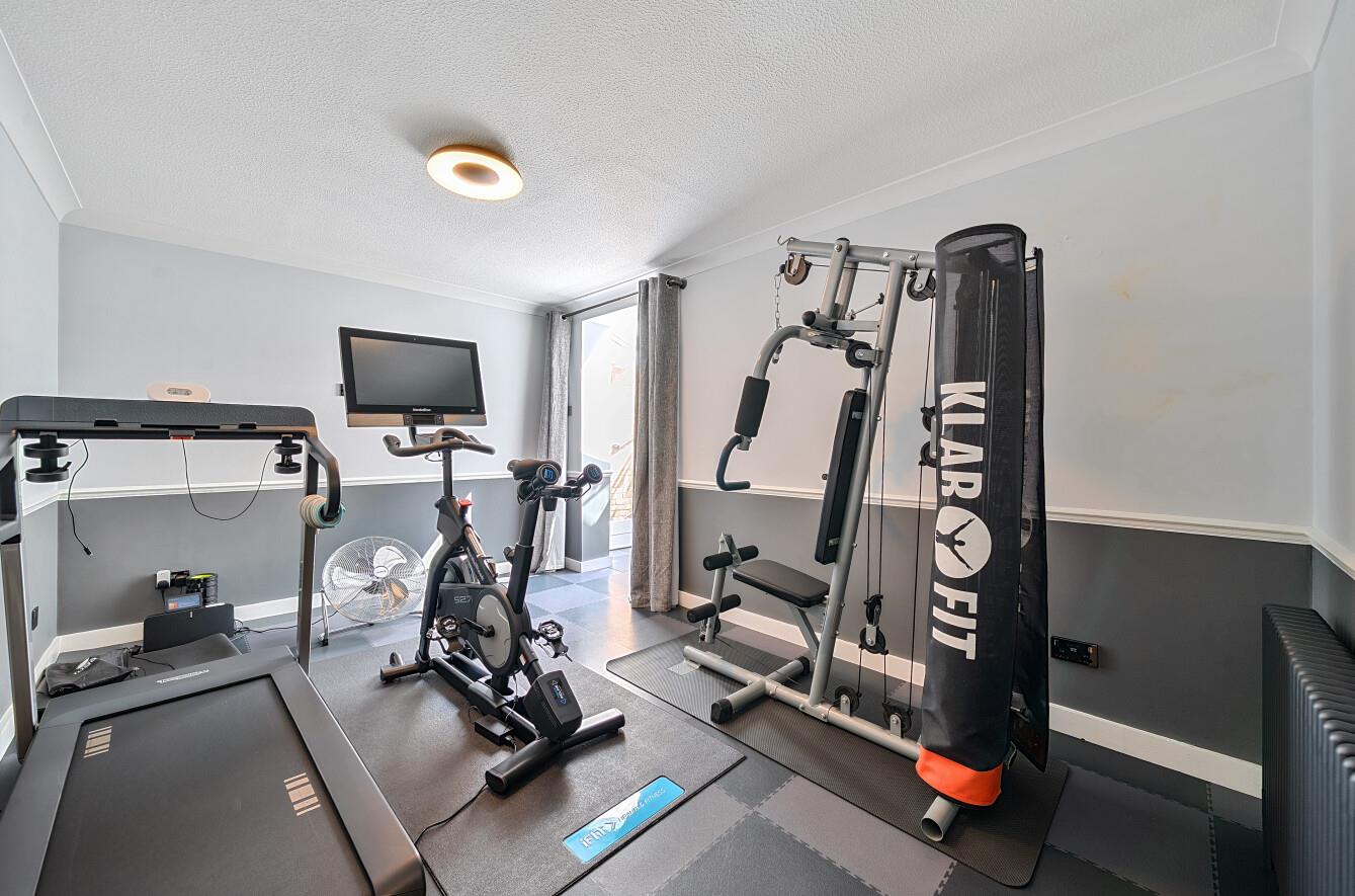 The lower ground floor is a study in adaptability. Two bedrooms, one currently used as a gym, sit alongside a wet room and a heated Endless Fitness swimming pool. The pool's modular design allows easy removal if desired, enabling the space to be transformed into a cinema room, dressing area, or other bespoke leisure space. The lower ground floor has the potential to create a fully self-contained annex, subject to acquiring planning permission. Internal access leads conveniently to the double garage, which incorporates a utility area.