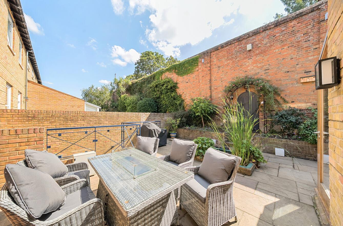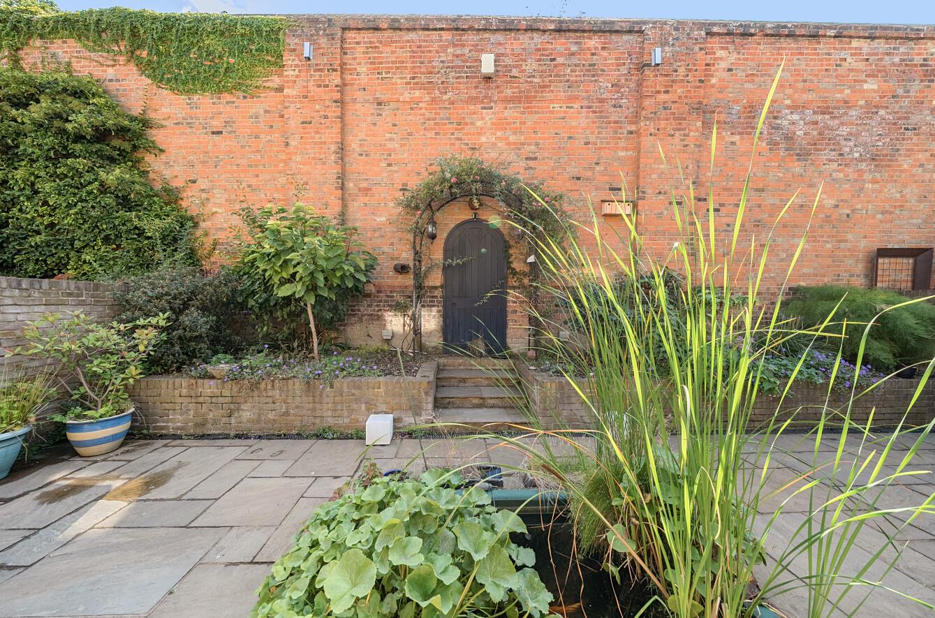 The private courtyard garden is a peaceful retreat, thoughtfully landscaped with raised beds and a pond, framed by the imposing Dockyard wall. It offers a secluded outdoor sanctuary, complementing the elegant interiors of the home.