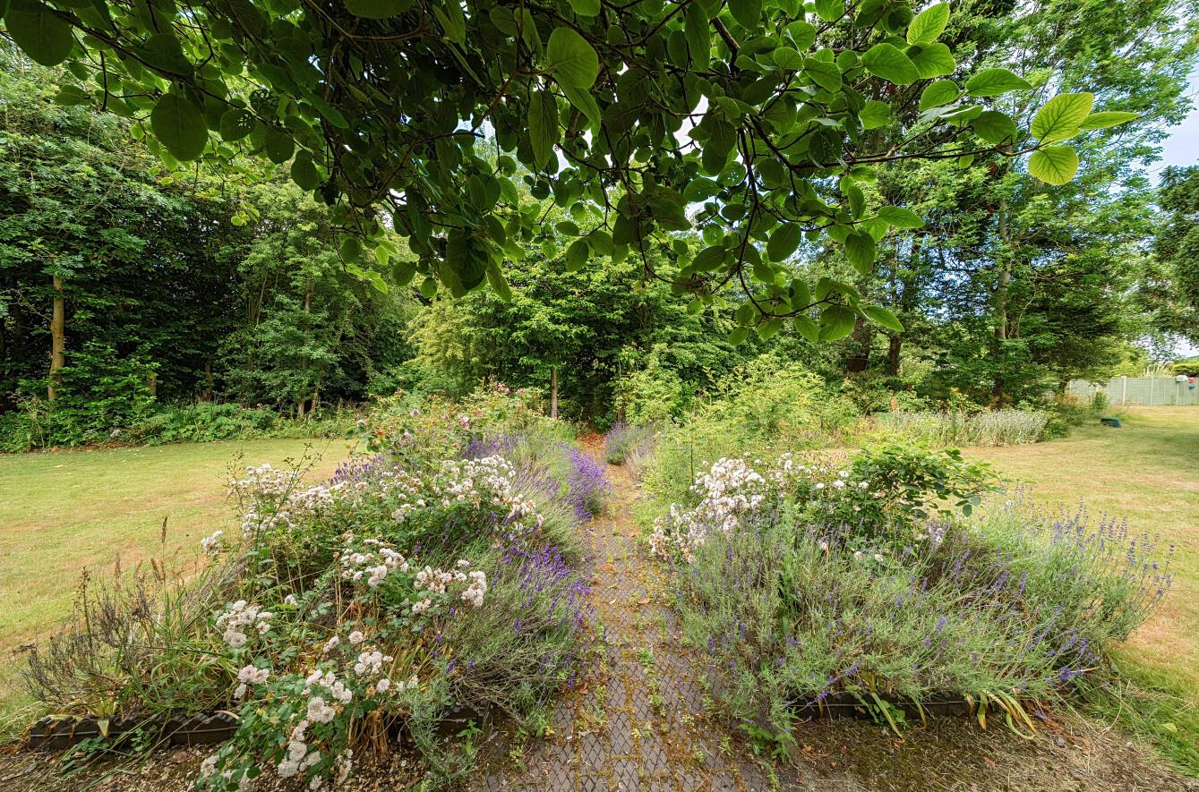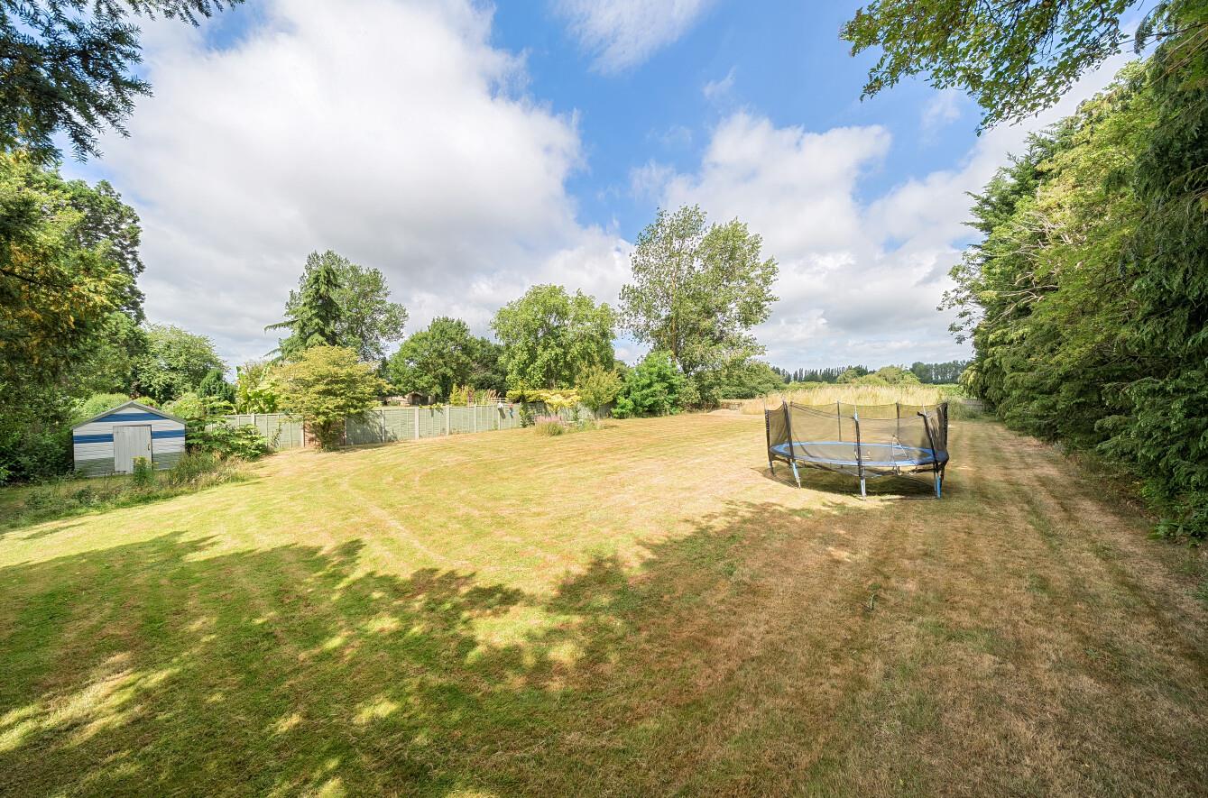 Outside, the property sits within mature and established gardens of around 1.2 acres. Towering redwoods and a range of ornamental trees and shrubs offer colour and structure throughout the seasons. A sweeping driveway leads to the front of the house, while a secondary access to the north provides additional parking and access to the garage, carport, and a selection of outbuildings.