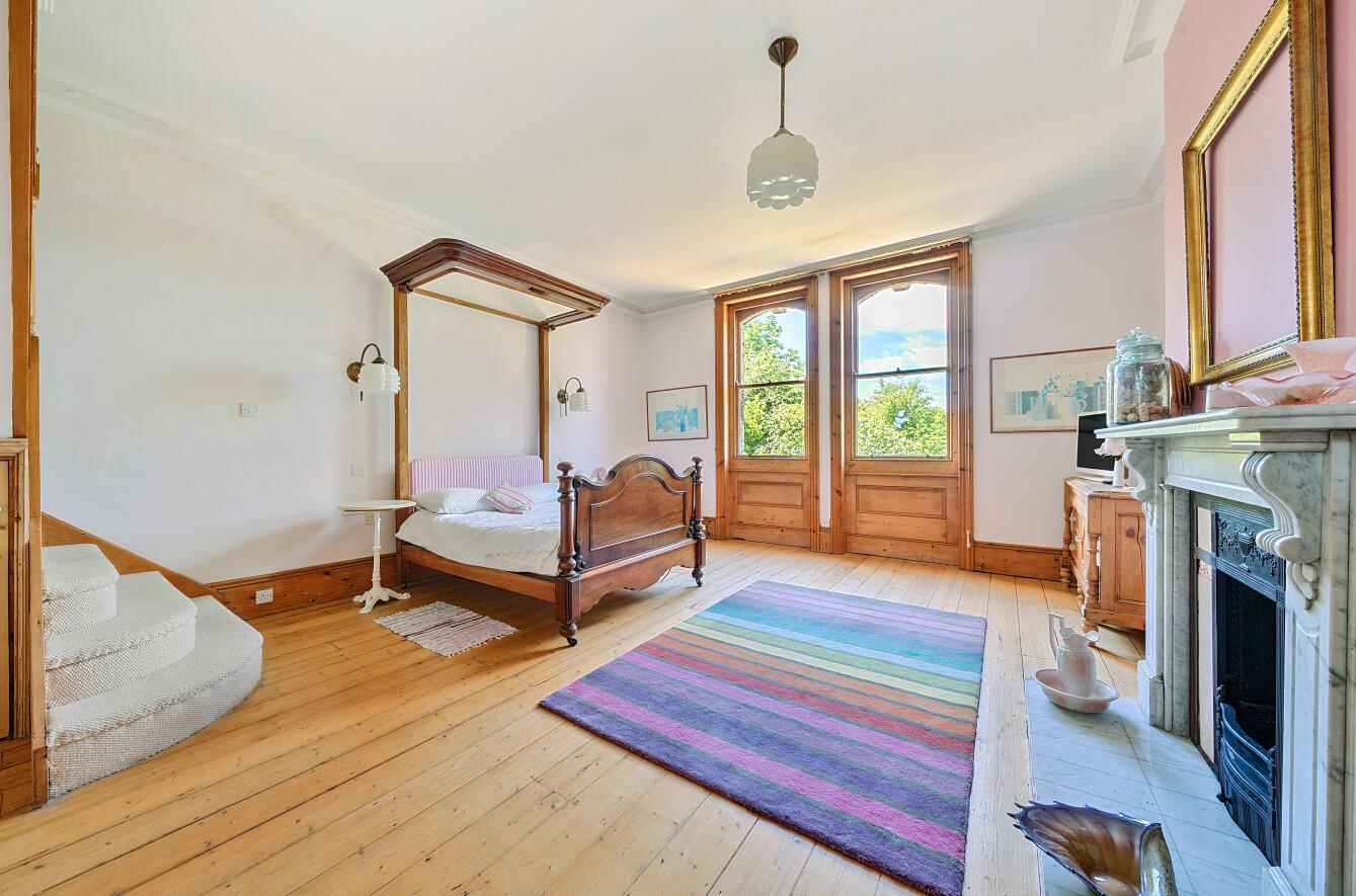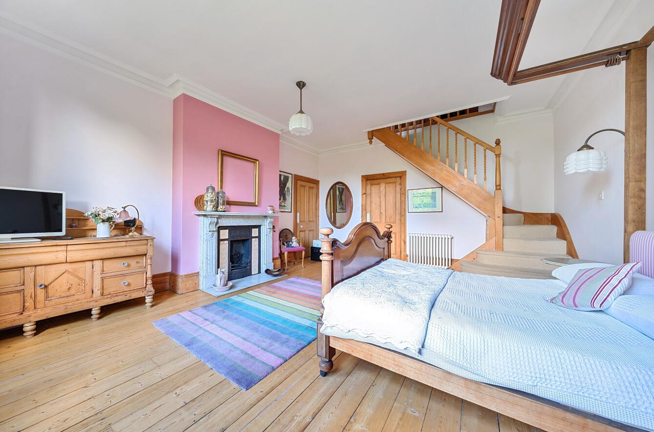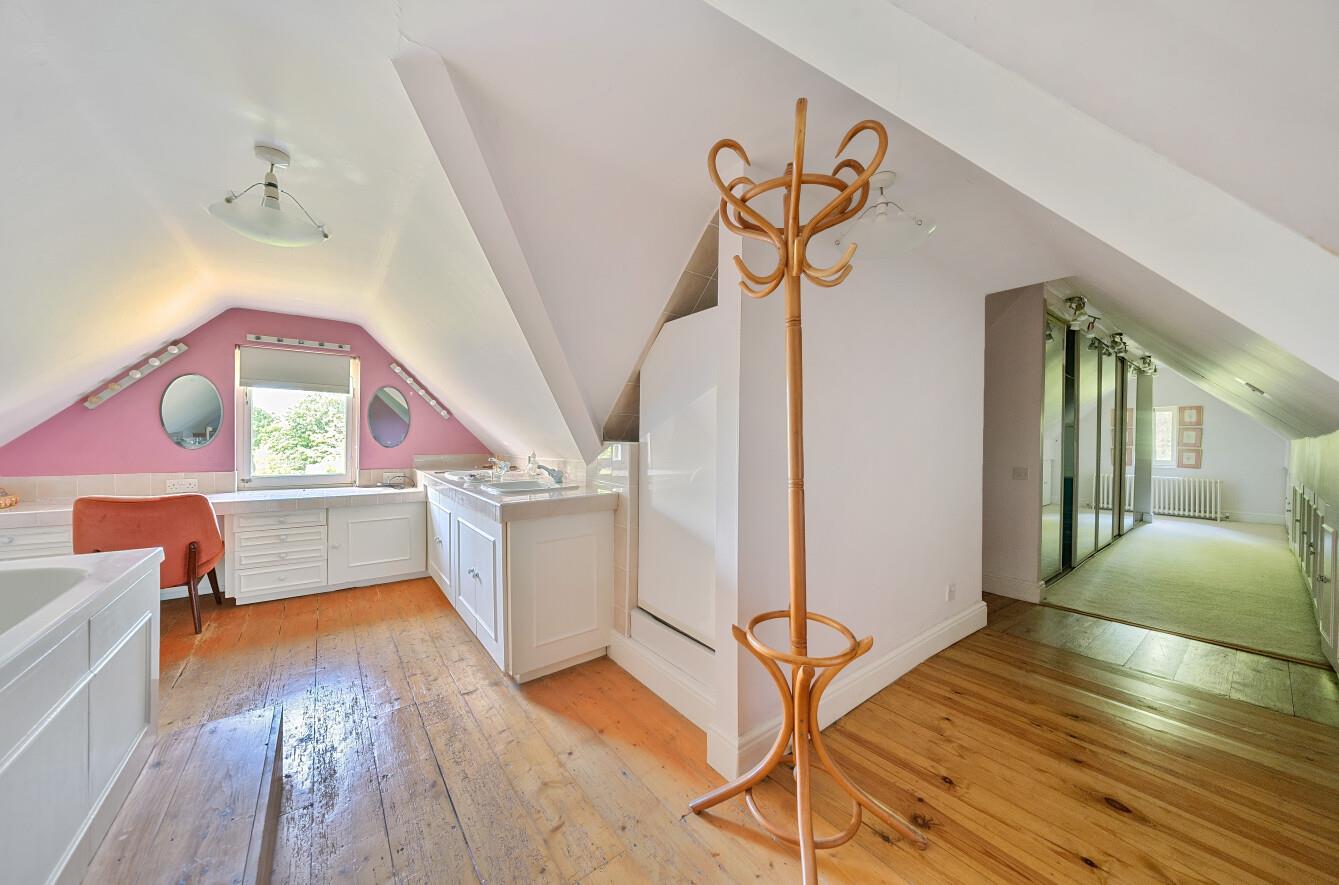 A striking staircase leads to the split level first floor. The principal bedroom suite is particularly special, with a private staircase leading to a large en suite bathroom and a dressing room complete with extensive fitted storage and eaves access. Five further bedrooms, a family bathroom, and a shower room complete the first floor, while the second floor offers two additional bedrooms, one currently used as a sitting room, alongside a bathroom and kitchenette, making this an ideal retreat for teenagers or long-term guests.