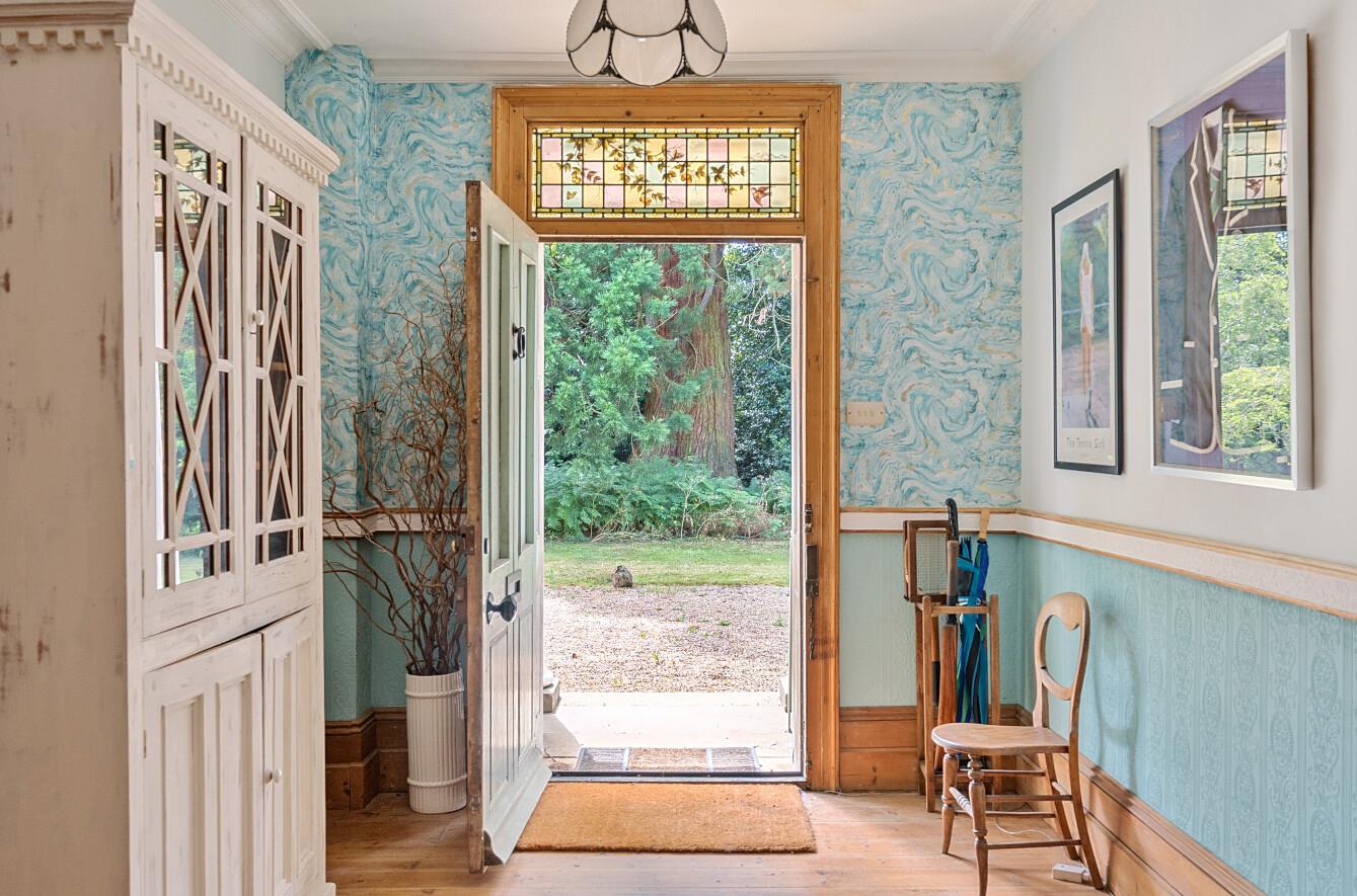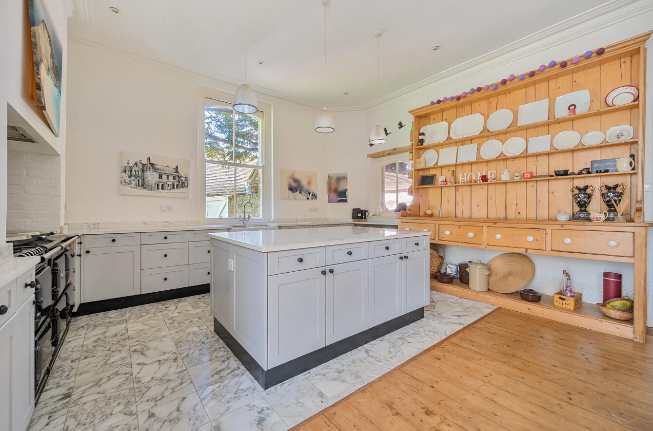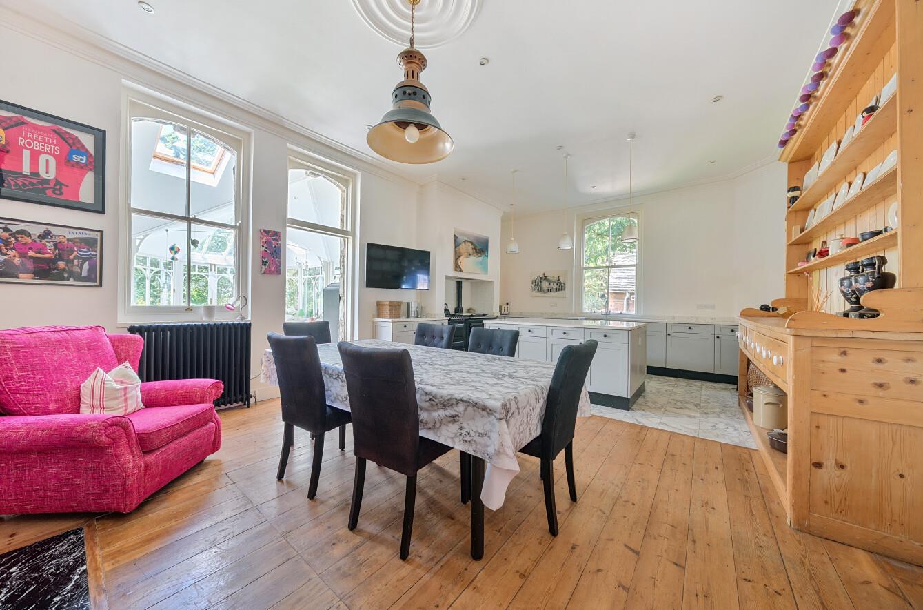 Throughout the home, original features add warmth and character: high ceilings, sash windows, ornate fireplaces in both marble and timber, and polished wooden floors. There are five principal reception rooms, each offering its own ambiance. The drawing room and study enjoy a southerly aspect, with an open fireplace and inset gas fire respectively. A generous billiard room provides the perfect space for entertaining, while the dining, sitting room, with French doors leading to the garden, was once the home's original kitchen. To the west, a spacious conservatory opens into the kitchen and captures the afternoon sun beautifully.