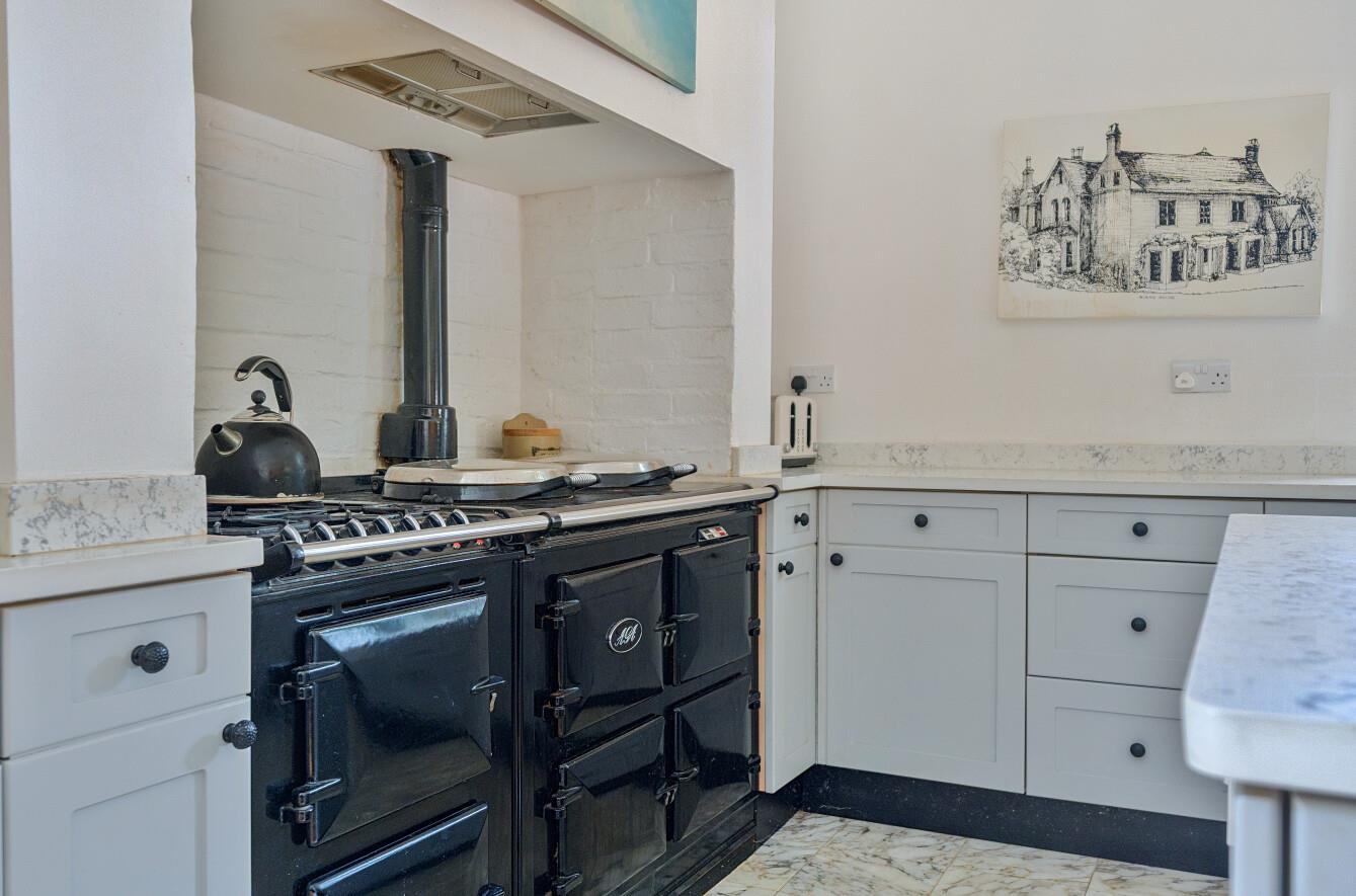 The kitchen, breakfast room is well appointed, featuring a range of fitted units with granite work surfaces, a central island, and a full complement of appliances, including a four oven AGA and companion. To the rear, a walk-in larder, utility room, laundry and guest WC provide useful everyday functionality.