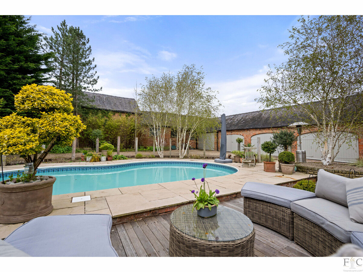 The property is accessed via a long gravel driveway, providing ease of movement and adding an attractive design element. Continuing to the rear of the house, the drive leads to garaging for three vehicles and additional storage. At the rear of the property, a sheltered landscaped terrace features a heated swimming pool, creating a fabulous outdoor space. A beautifully planted walled garden provides a private, tranquil retreat, while a side garden with an orchard enjoys views over the adjoining 3.5-acre paddock (STM), which benefits from mains water.