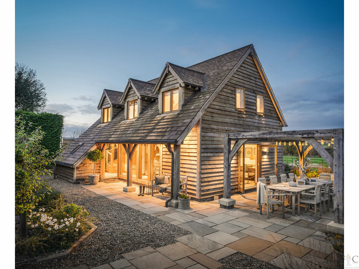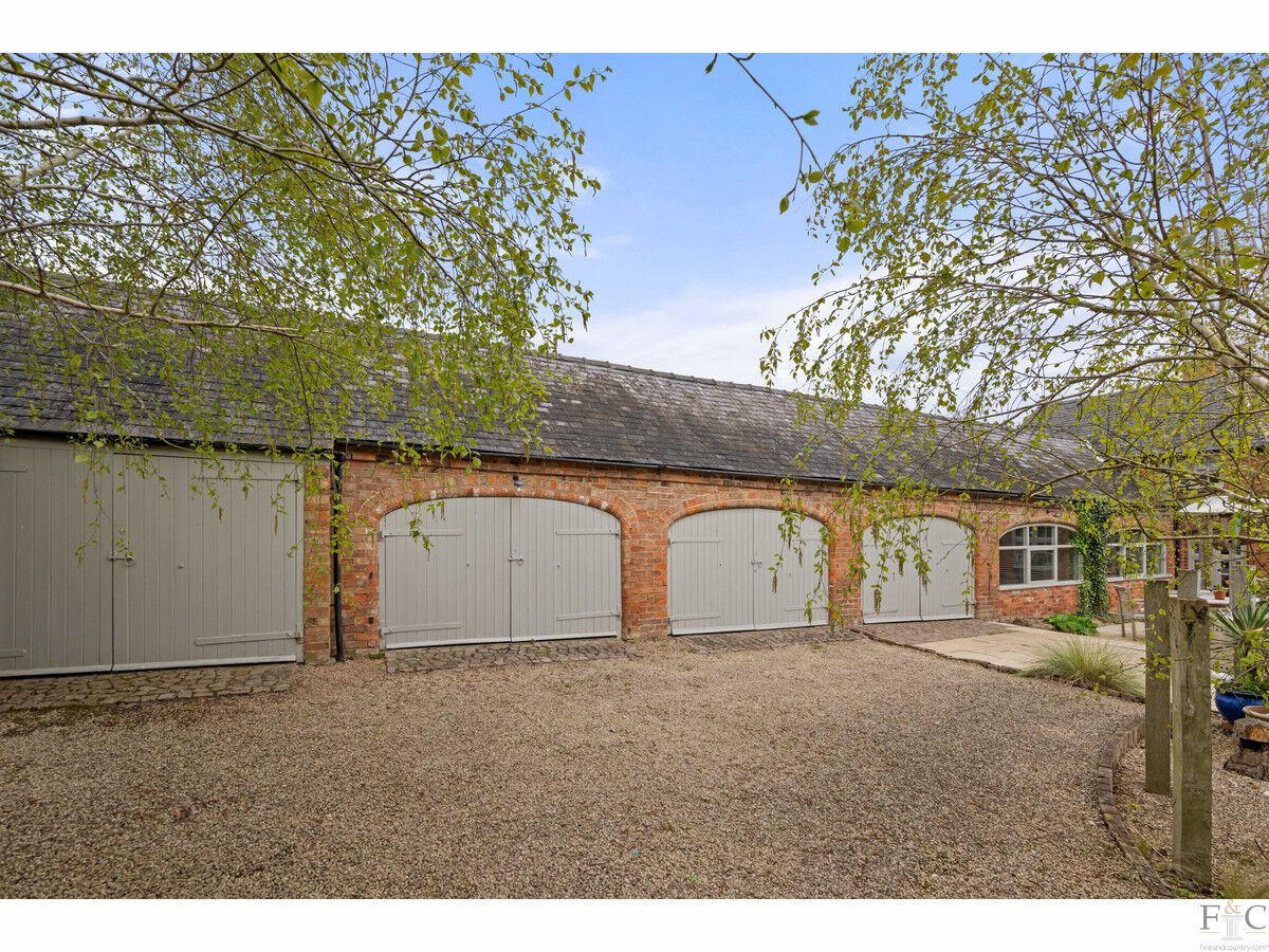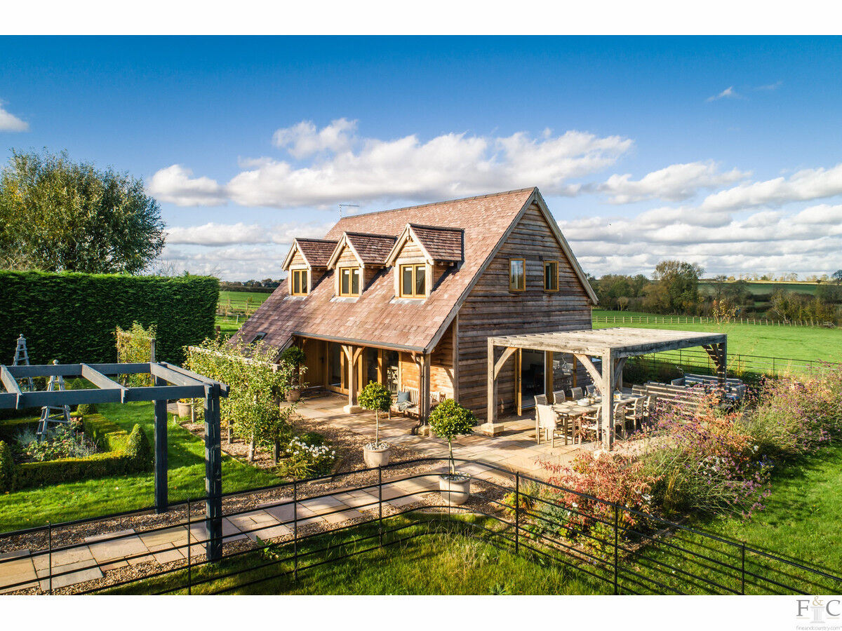 included in the sale, is a charming oak-framed property built by Oakwrights in 2019, with six years remaining on its build guarantee. Currently run as a boutique holiday rental, the well-proportioned accommodation is beautifully presented and spans two floors. The ground floor includes an entrance hall with fitted cloak cupboard and utility room, a spacious double bedroom with ensuite bathroom, and a stunning open plan living area, featuring a fully equipped kitchen, dining space, and lounge. A striking double-height glazed window illuminates the hallway and stairwell and frames the picturesque countryside views that surround the property. To the first-floor are three further double bedrooms all with ensuite facilities. Hares Furrow is nestled within its own private grounds and features a delightful knot garden with espalier fruit trees, and a wonderful terrace with a pergola overlooking the paddock, that is an excellent outdoor entertaining space.