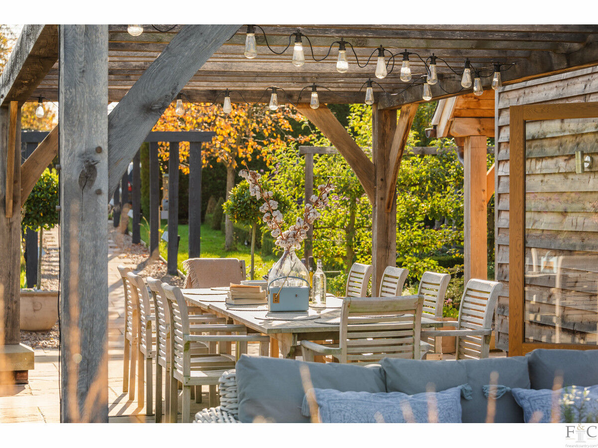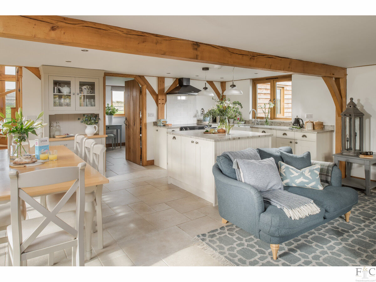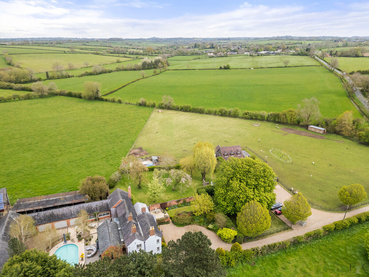 included in the sale, is a charming oak-framed property built by Oakwrights in 2019, with six years remaining on its build guarantee. Currently run as a boutique holiday rental, the well-proportioned accommodation is beautifully presented and spans two floors. The ground floor includes an entrance hall with fitted cloak cupboard and utility room, a spacious double bedroom with ensuite bathroom, and a stunning open plan living area, featuring a fully equipped kitchen, dining space, and lounge. A striking double-height glazed window illuminates the hallway and stairwell and frames the picturesque countryside views that surround the property. To the first-floor are three further double bedrooms all with ensuite facilities. Hares Furrow is nestled within its own private grounds and features a delightful knot garden with espalier fruit trees, and a wonderful terrace with a pergola overlooking the paddock, that is an excellent outdoor entertaining space.