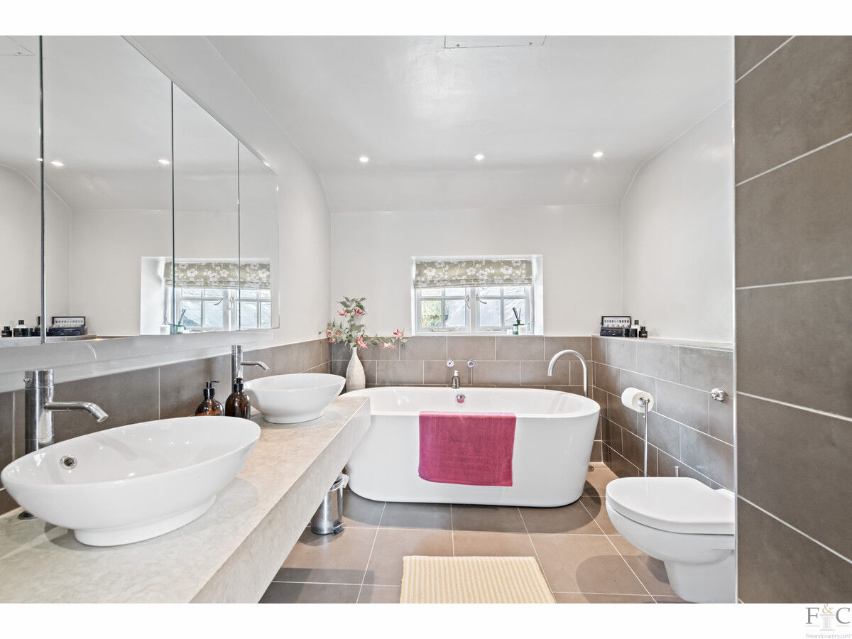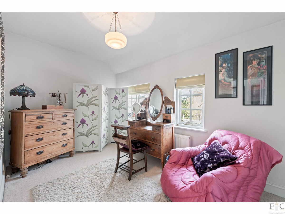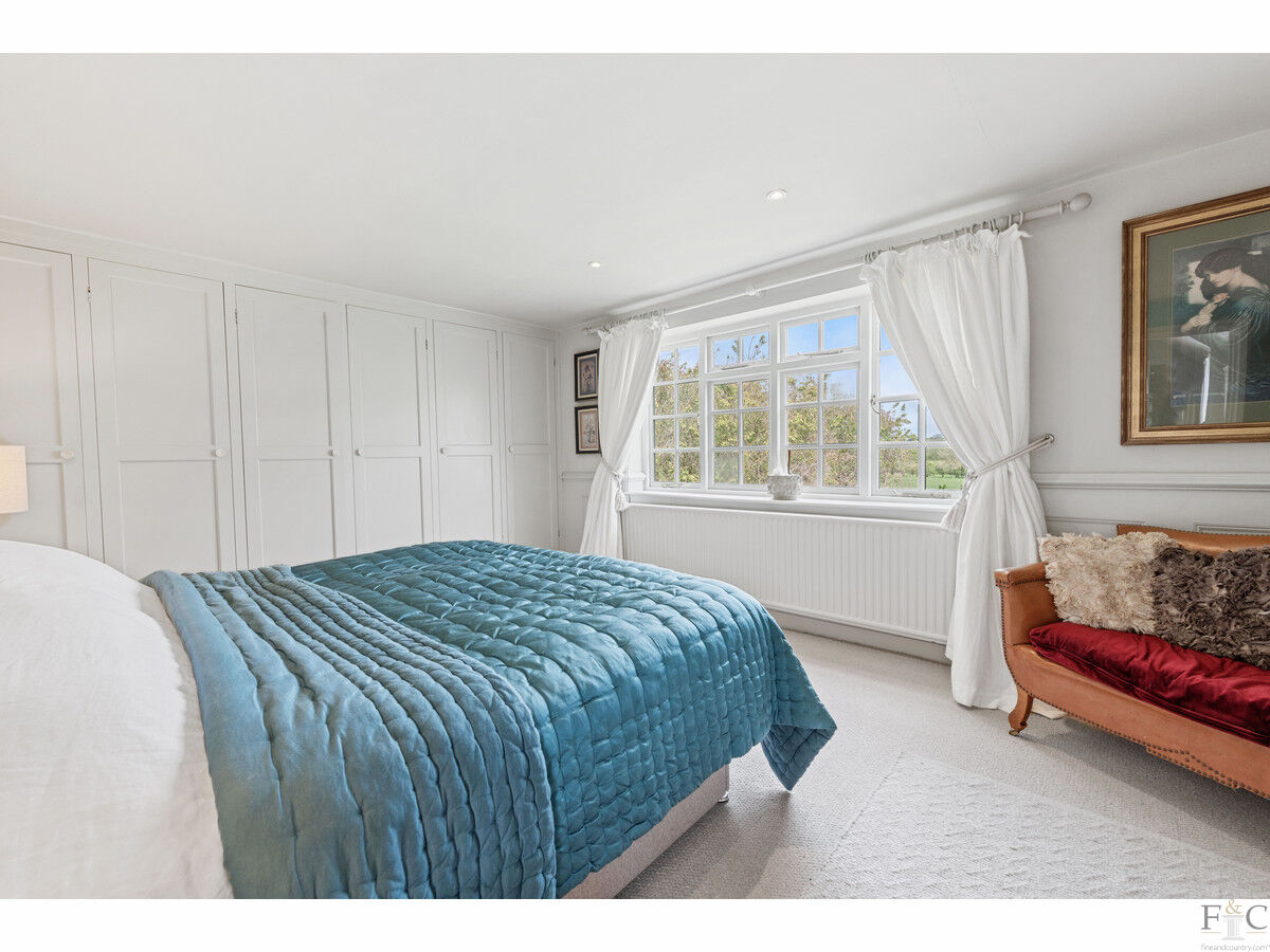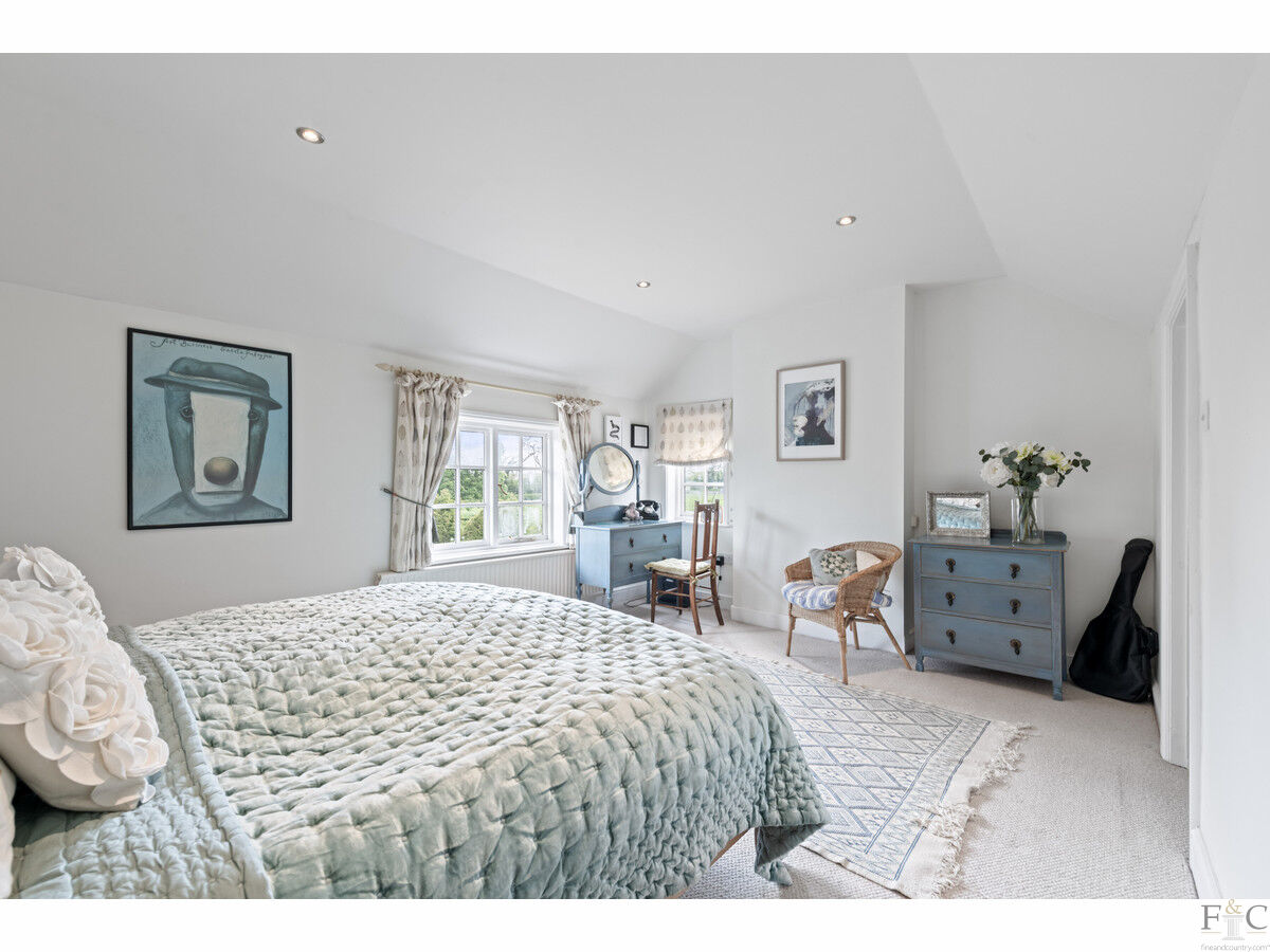 On the first floor, the dual-aspect master bedroom offers uninterrupted views over open countryside and Burton Overy village, positioned to create a master wing. It features an adjacent four-piece bathroom that includes a freestanding bath, while bedroom five serves as a dressing room. Additionally, a dual- aspect guest room with its own ensuite bathroom, along with two further bedrooms that share access to an additional bathroom.
