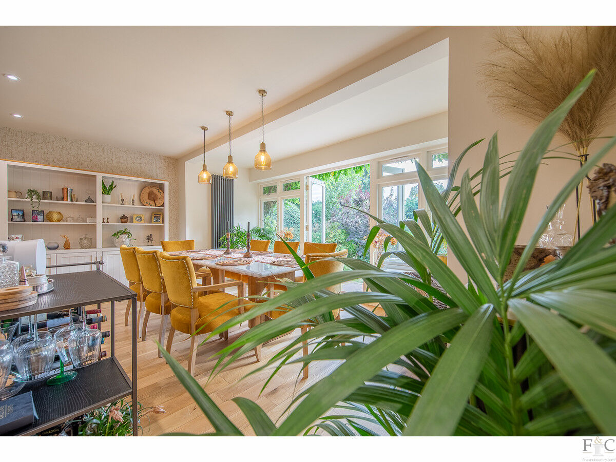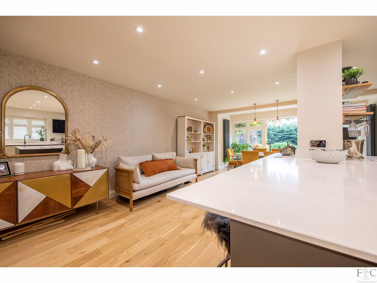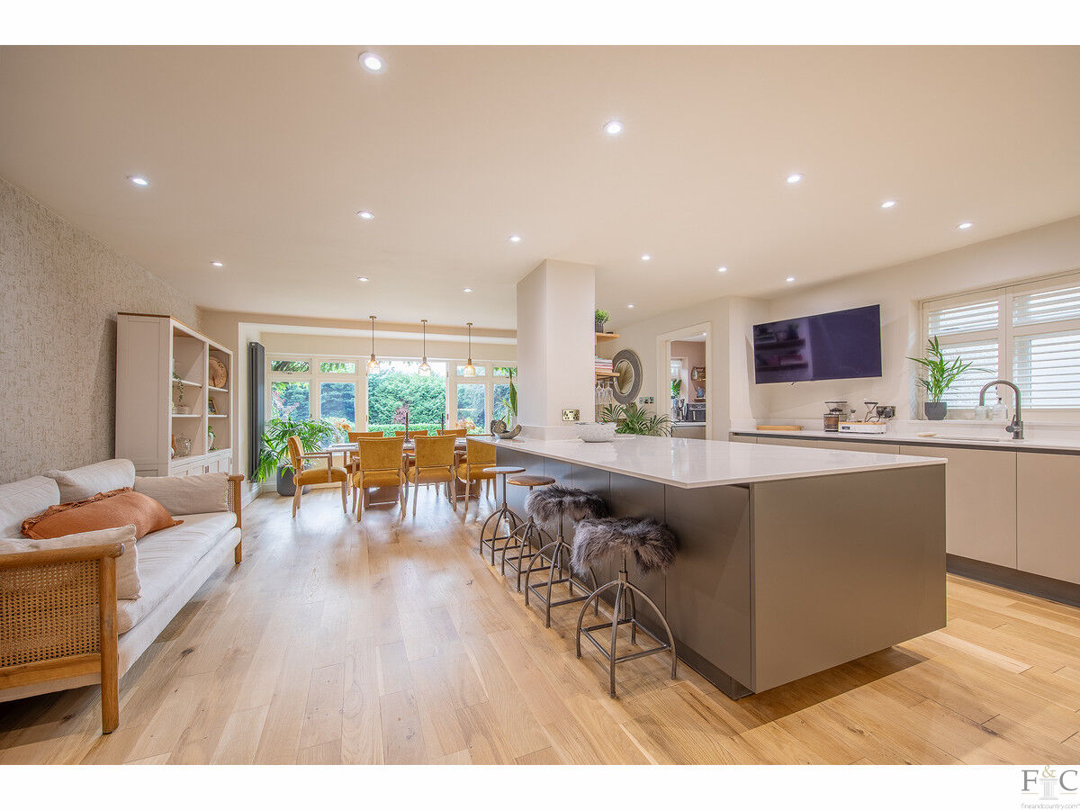 The ground floor offers a seamless flow between spaces, with two reception rooms: a cosy sitting room and a spacious formal lounge. Both rooms feature large bay windows that let in plenty of natural light. The lounge also enjoys French doors opening onto the rear terrace and a wood-burning stove set in a stone surround. A stunning open plan living, dining, and kitchen area creates the perfect space for entertaining family and friends. The well-equipped kitchen features sleek, contemporary units with granite countertops and a large central island with informal seating. A solid oak floor extends throughout this desirable living space, while the dining area is thoughtfully positioned alongside large, glazed windows and a set of French doors, allowing access to and views of the sunny terrace and gardens beyond. Practical features include a guest cloakroom and a convenient utility/laundry room.