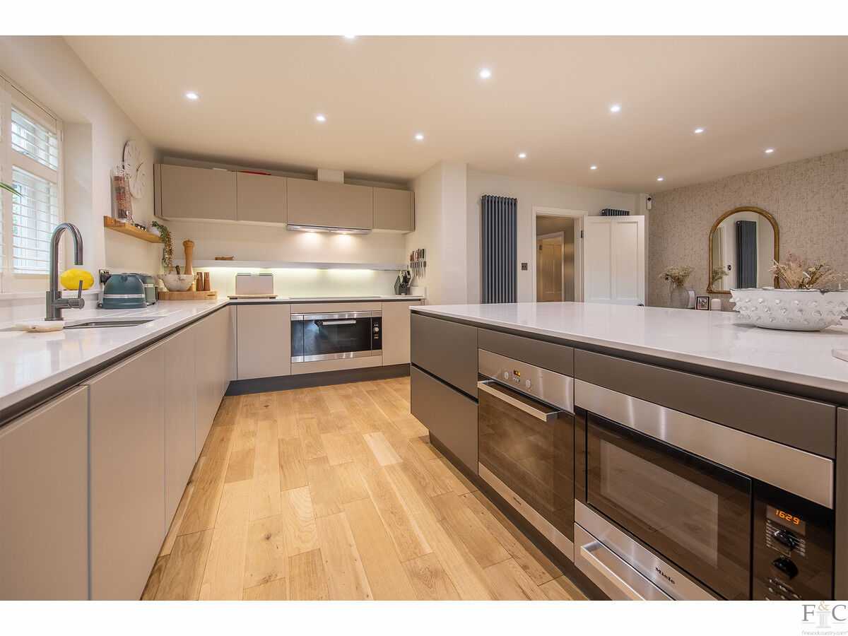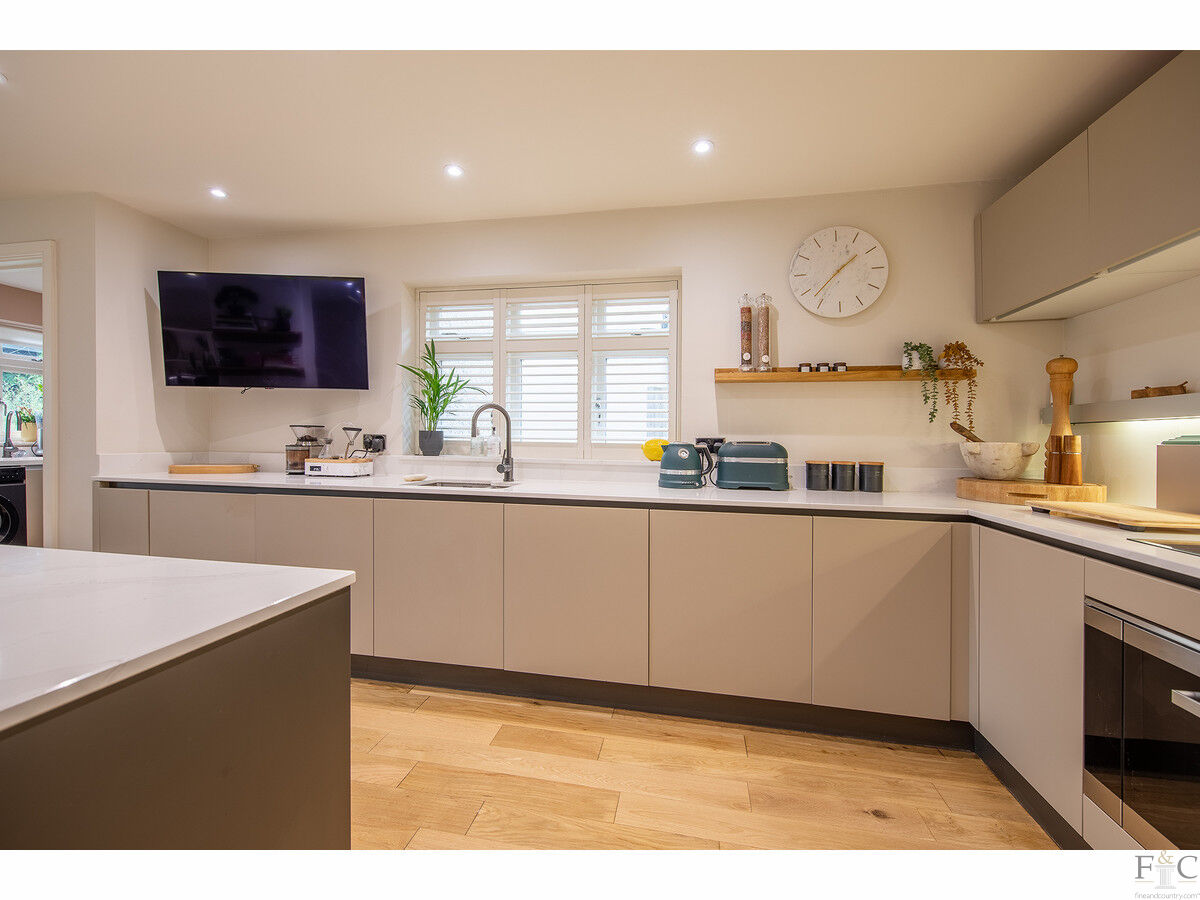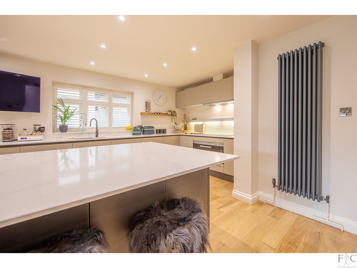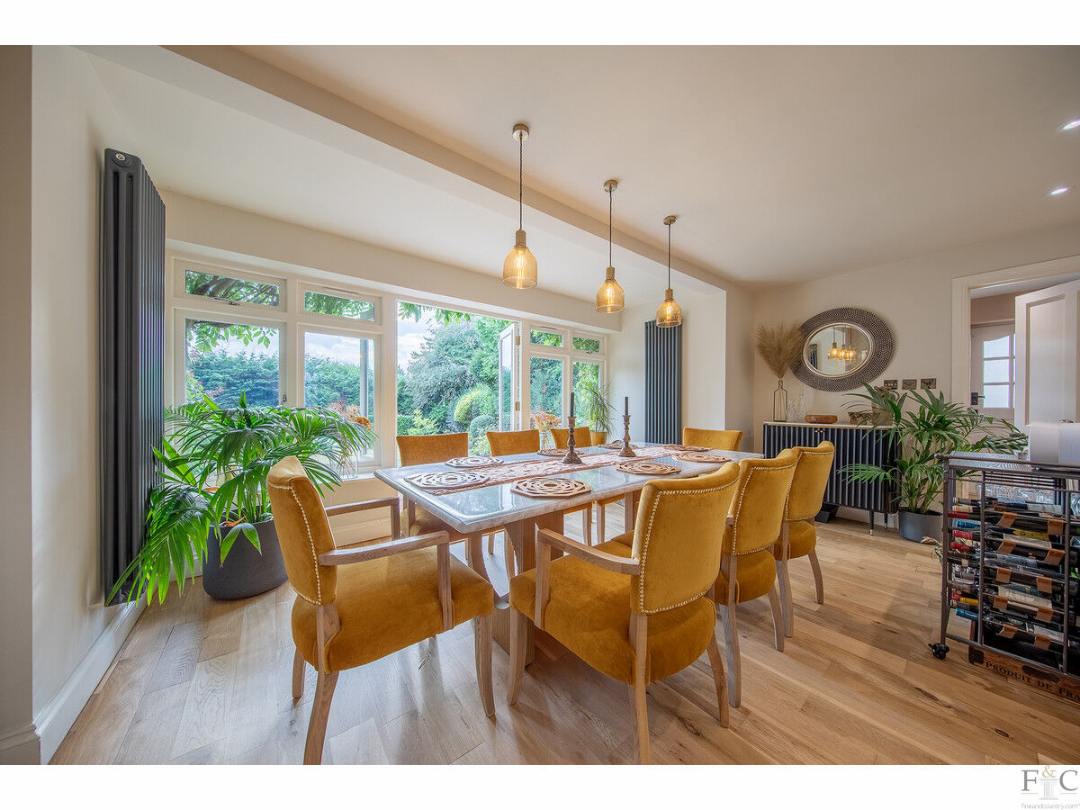 The ground floor offers a seamless flow between spaces, with two reception rooms: a cosy sitting room and a spacious formal lounge. Both rooms feature large bay windows that let in plenty of natural light. The lounge also enjoys French doors opening onto the rear terrace and a wood-burning stove set in a stone surround. A stunning open plan living, dining, and kitchen area creates the perfect space for entertaining family and friends. The well-equipped kitchen features sleek, contemporary units with granite countertops and a large central island with informal seating. A solid oak floor extends throughout this desirable living space, while the dining area is thoughtfully positioned alongside large, glazed windows and a set of French doors, allowing access to and views of the sunny terrace and gardens beyond. Practical features include a guest cloakroom and a convenient utility/laundry room.
