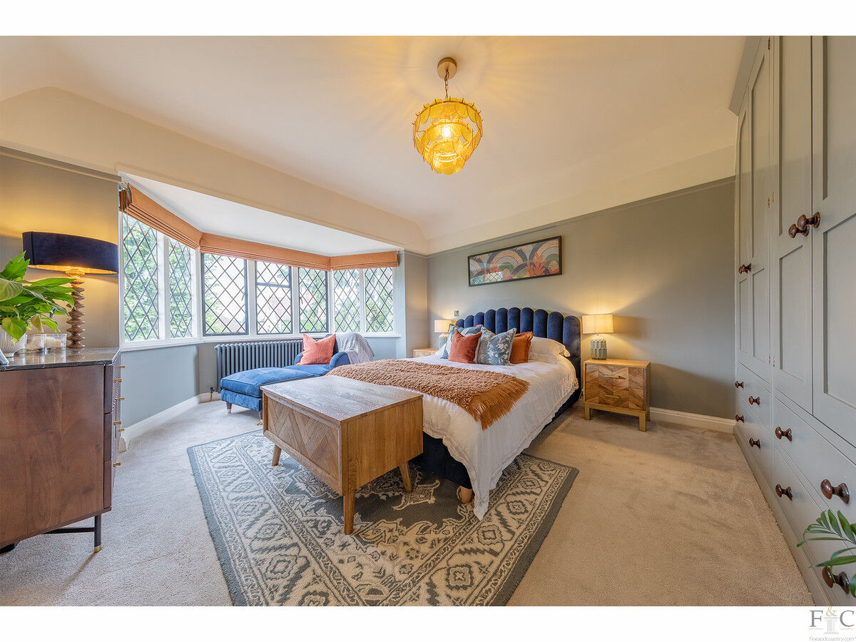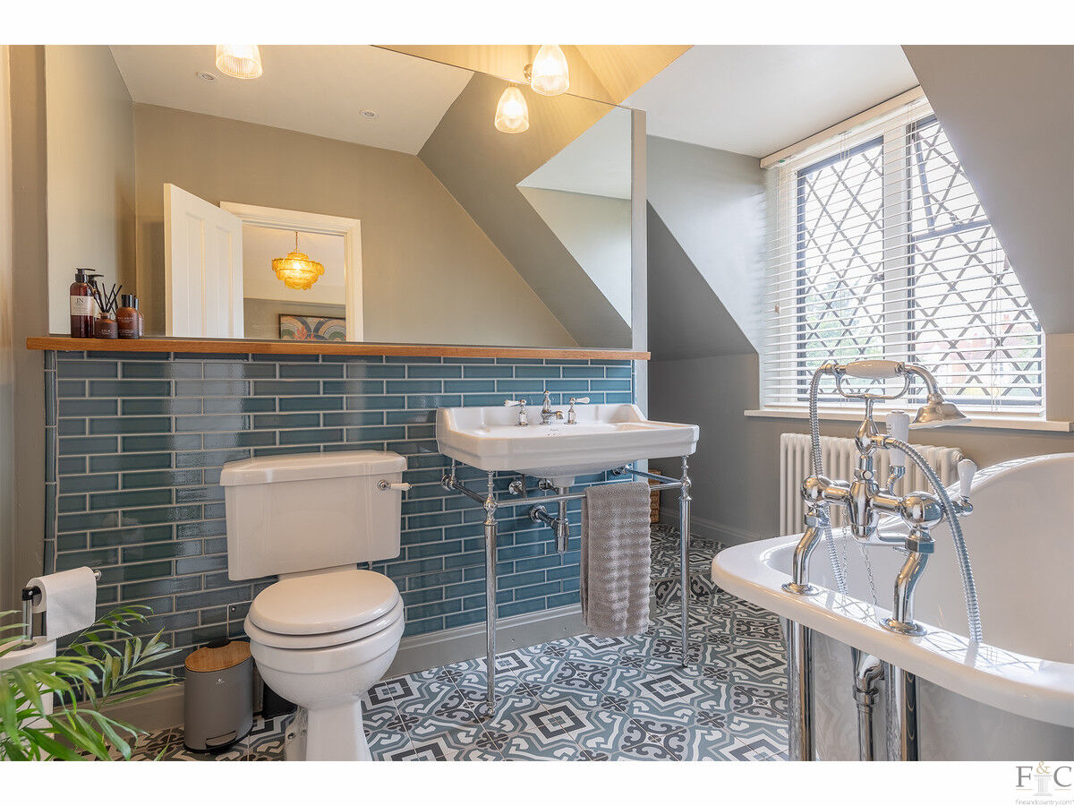 A welcoming entrance hall with a striking dog-leg staircase and a beautiful stained-glass window leads to four generously sized bedrooms and three bathrooms