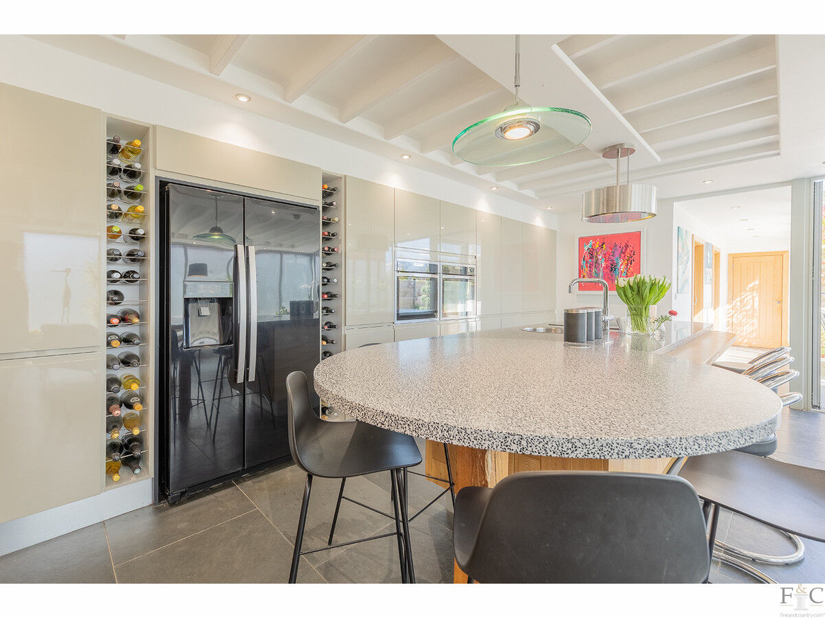 The central island houses an induction hob, a sink with boiling water tap and waste bin cupboard. A curved Corian worktop provides seating for eight people and a full height wall of cupboards includes a small pantry area. Further worktops permit food preparation and spaces for equipment while integrated appliances such as a fridge freezer and eye level electric oven and steam oven are also included. A wine rack, two large larder cupboards, a double door cupboard for coats and a feature bookcase made from French oak includes two large cutlery drawers and completes the designer kitchen.
