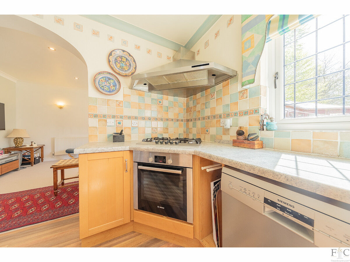 At the heart of the home lies the kitchen and breakfast room — a warm, functional space with fitted cabinetry, a central island, and a charming outlook to both the driveway and rear garden. Tiled with character and filled with light, it blends style and practicality in equal measure.