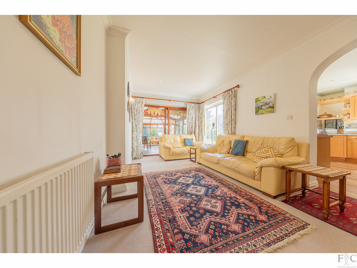 To the right, the formal sitting room stretches wide and inviting, crowned with an elegant bay window that floods the room with natural light. A feature fireplace, bespoke bar area, and French doors leading to the sun-soaked south-facing garden combine to create a space ideal for both peaceful moments and vibrant gatherings.