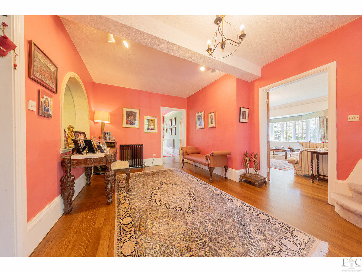 Your arrival is met with a recessed arched porchway, framing the original front door and setting the tone for what lies beyond. Step into the impressive entrance hall, where character radiates from every corner — high ceilings, warm wooden floors, and a sense of space that flows freely from room to room. Under-stair storage and a discreet cloakroom ensure practical needs are effortlessly met.