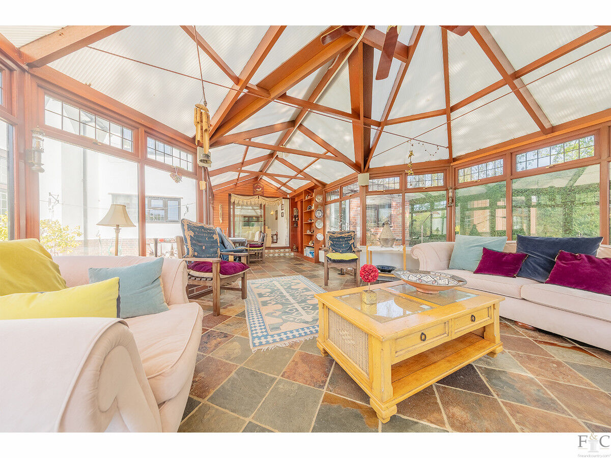 From the lounge, glazed doors lead into a glorious sunroom — a space where timber beams, slate flooring, and panoramic glazing create the perfect place to sit, read, dine or simply admire the serene garden beyond. The south-facing rear garden becomes an extension of this room, inviting nature in, all year round.