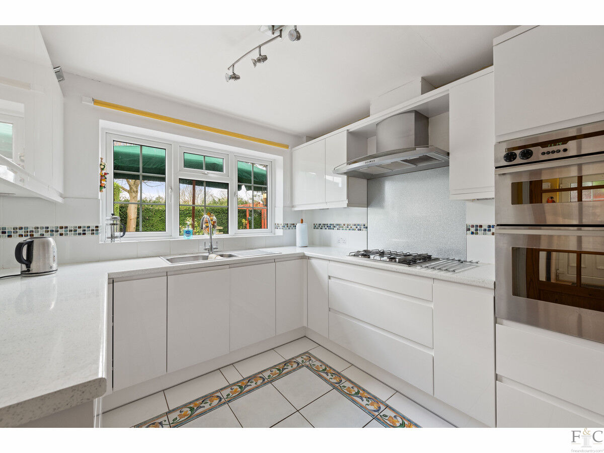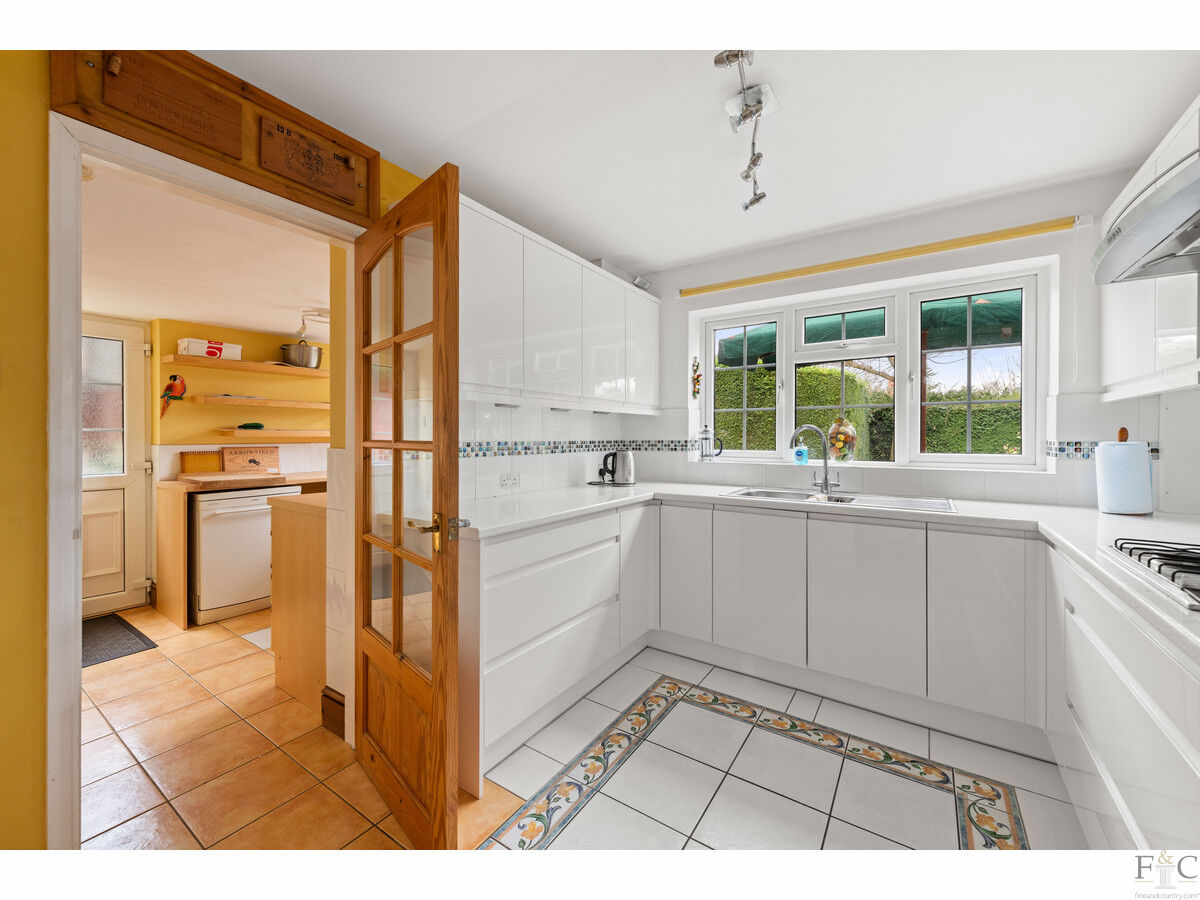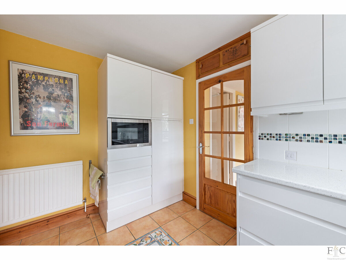 The kitchen provides storage space and countertops for food preparation against four walls. The smooth, handleless units are in white and the integrated appliances include a hob with extractor hood, double oven, microwave and a dishwasher. Both the kitchen and utility have tiled flooring and sinks under the windows looking out towards the garden. The utility has additional worktops and cupboards, with plumbing for all laundry needs, including space for a washing machine and vented tumble drier. A back door from here allows access into the garden and lastly, there is a further internal door to a room currently used for storage.