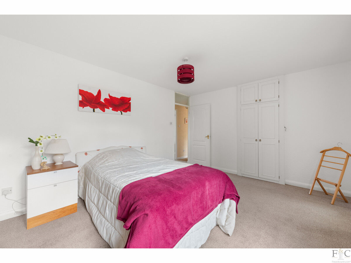The living room is spacious and airy. It overlooks the front garden and benefits from two bay windows. It is presently divided by furniture that allows a cosy seating area and a separate dining area. The lounge across the hall has a dual aspect, with a third bay window and French doors opening into the garden. It is a large, well lit room and houses a raised, recessed circular fireplace.