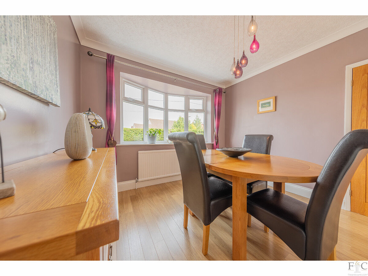 The lounge is entered from the hallway. It has hardwood flooring and dual aspect windows: a bay window overlooking the drive and over sliding patio doors. They open onto a raised and stepped patio, leading into the rear garden and are a few steps away from a back door opening into the kitchen.