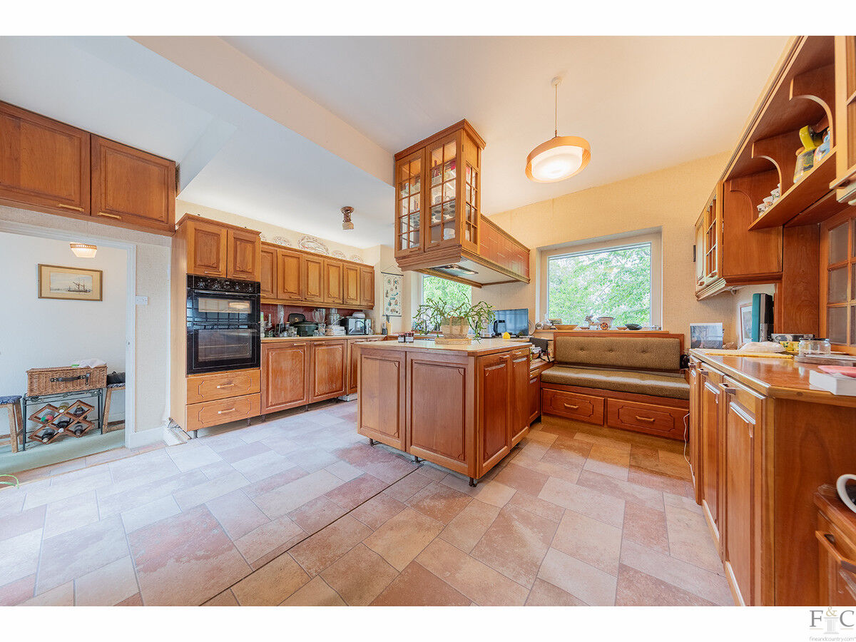 The kitchen, rich with warm timber cabinetry and fitted appliances, centres around a peninsula island with electric hob and informal seating – charming and practical in equal measure. A walk-in pantry adds heritage character and useful storage.