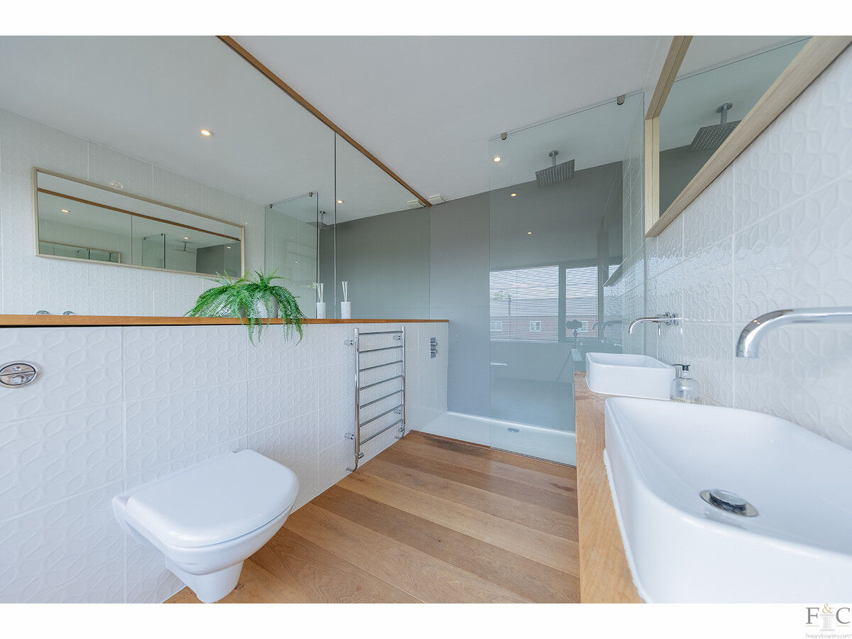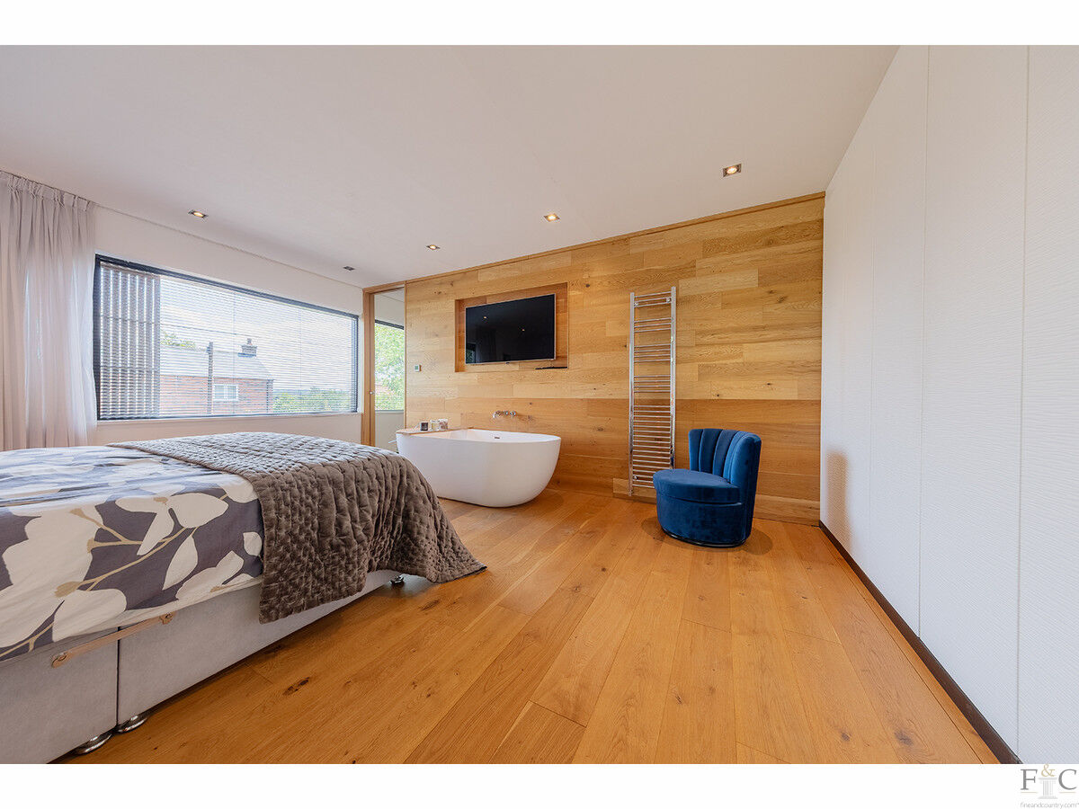 The bespoke oak staircase leads to a glass and steel bridge, linking to a first-floor landing with potential as a study or quiet reading space. The principal bedroom, two further double bedrooms, and a shower room are located on this floor. The main bedroom features sleek fitted wardrobes, a freestanding bath positioned to enjoy the far-reaching countryside views, and a stylish en-suite with twin basins and a walk-in shower.