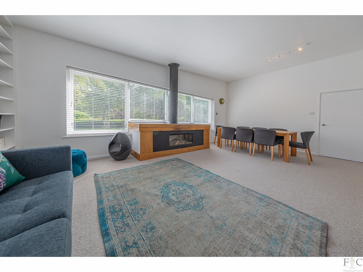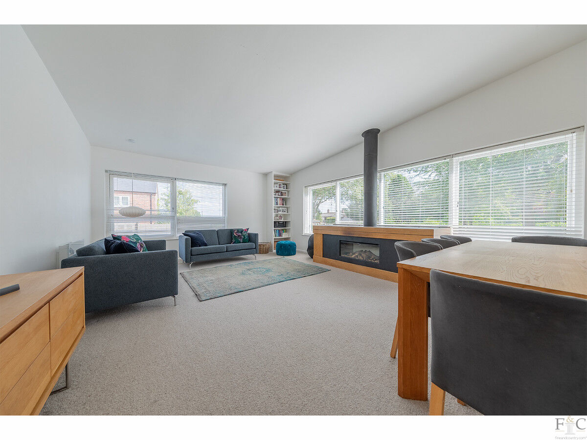 There are two distinct living rooms: the relaxed family lounge that opens onto the dining kitchen and a formal lounge/diner, both with dual aspects and garden views. The formal living/dining space features a contemporary electric stove, offering a stylish yet cosy backdrop for gatherings.