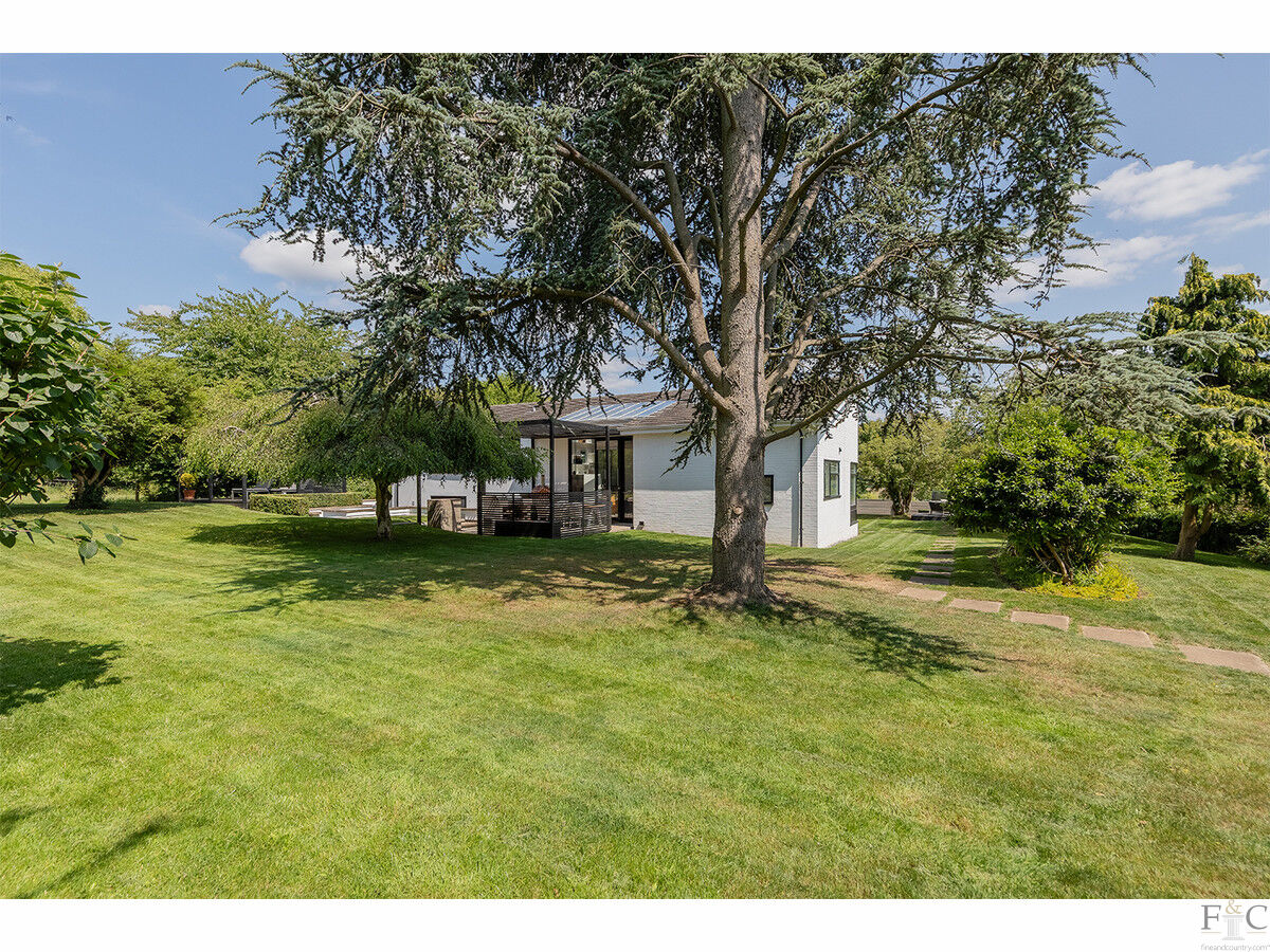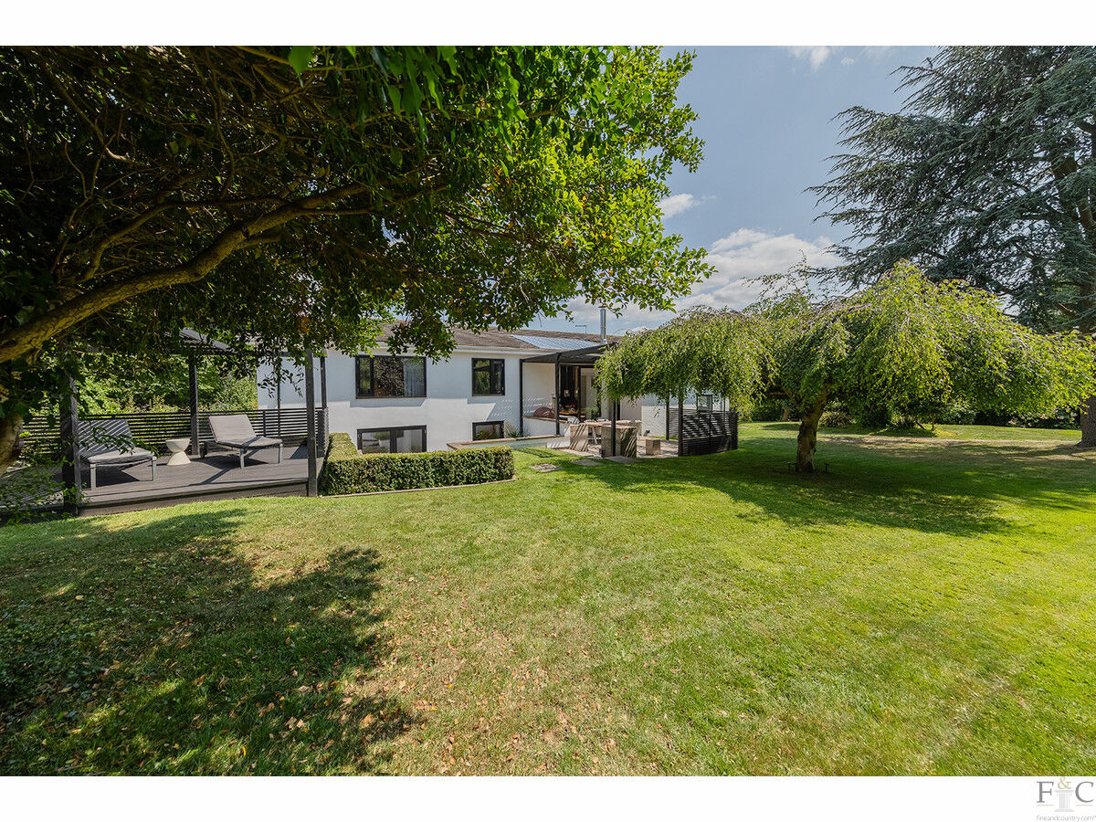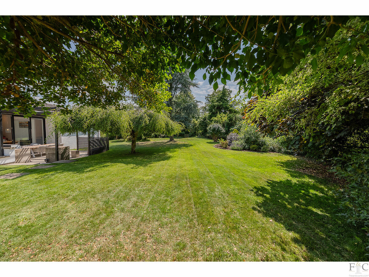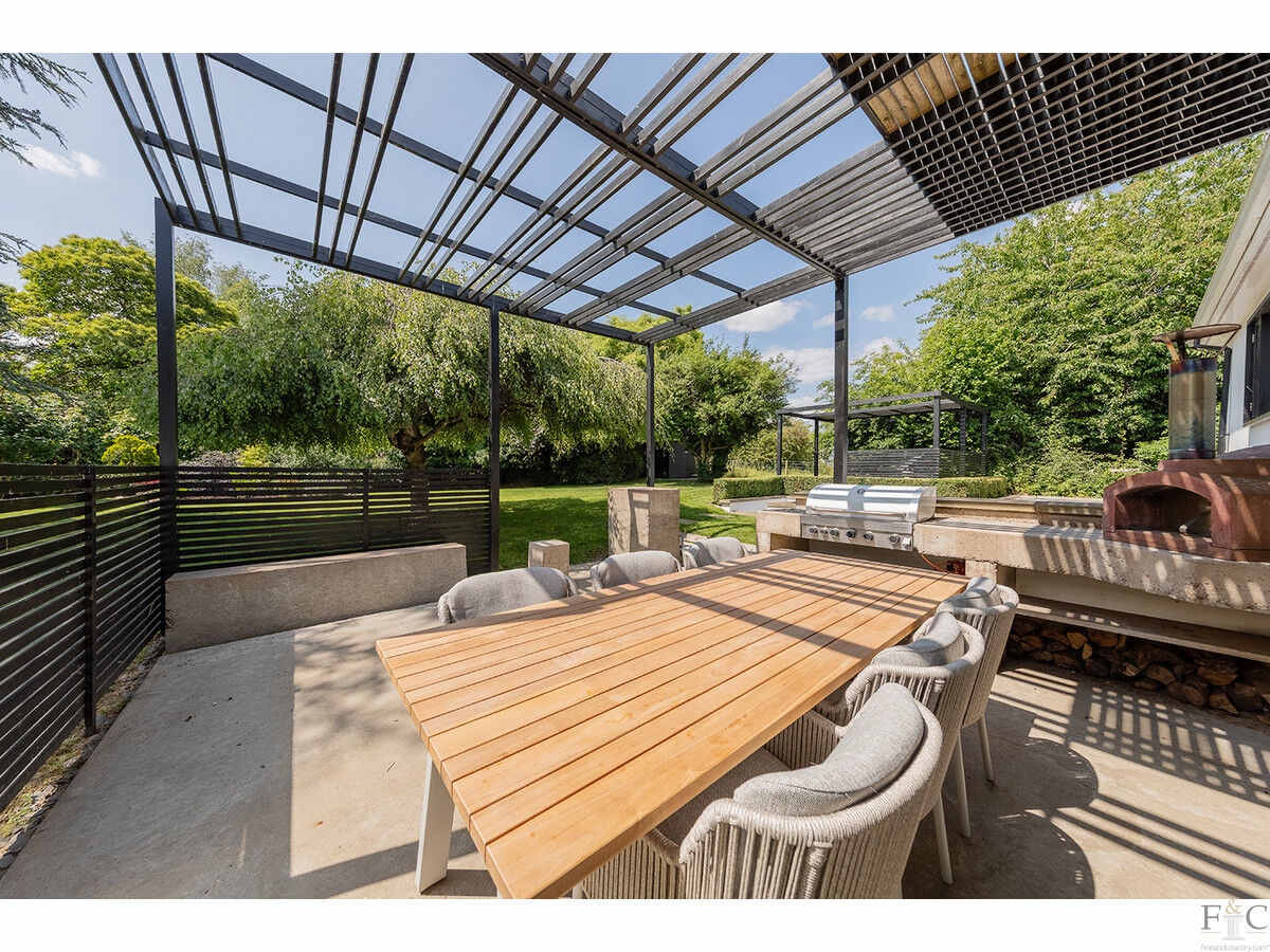 The gardens envelop the house with a mix of structured planting and specimen trees, alongside a generous concrete terrace housing a built-in barbecue and stone pizza oven — ideal for alfresco entertaining in a truly private setting.