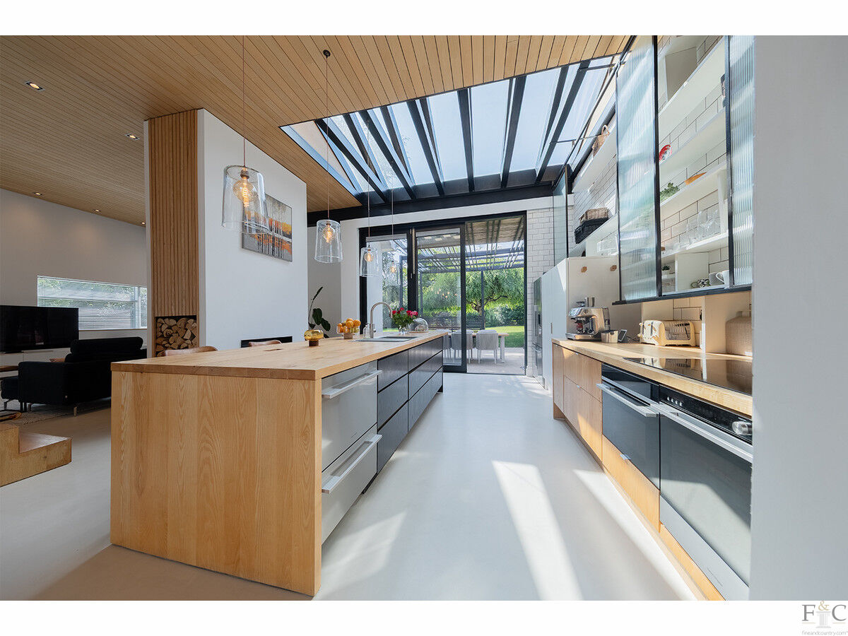 A dramatic entrance is made via a large hardwood pivot door beneath a suspended metal and timber canopy, leading into a bright, double-height atrium with overhead glazing, whitewashed brick walls, and warm microcement flooring. Light floods every corner of the house, enhanced by floor-to-ceiling glass, skylights, and carefully curated materials.