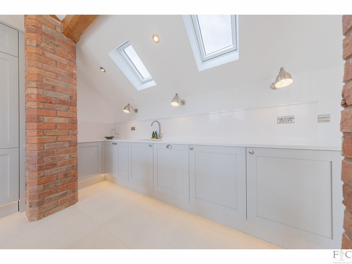 The black gas fire is a statement piece at the opposite end of this fantastic room and it can be arranged to include cocooning cosy nooks or enjoyed as a whole for larger scale entertaining, depending on furniture and need. The internal décor remains beautifully neutral with coordinating hard flooring, exposed brick walls, beams and pillars. It is designed for fluidity and is undoubtedly the heartbeat of the home.
