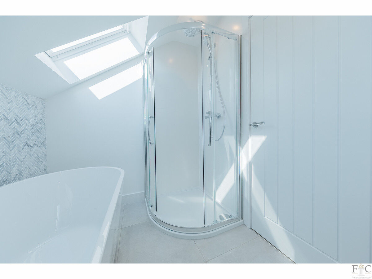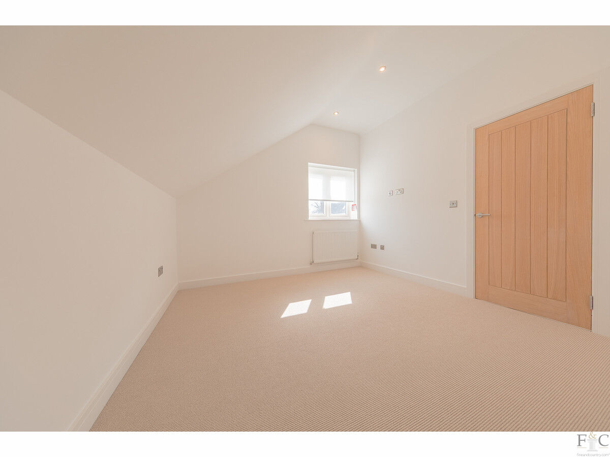 Bedroom two has integral storage and an ensuite consisting of a walk in shower, toilet, and heated towel rail and mirror unit. All of the bedrooms are similarly decorated and finished to a high standard. They are all carpeted and have vaulted ceilings, with bedroom three having skylights. The large end bedrooms have windows in the apex part of the barn roof and look out into the surrounding countryside.