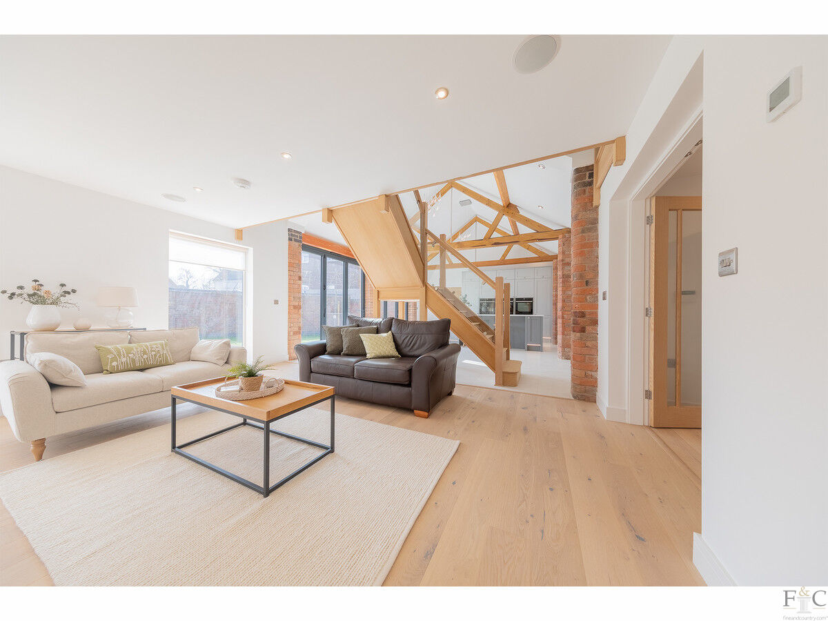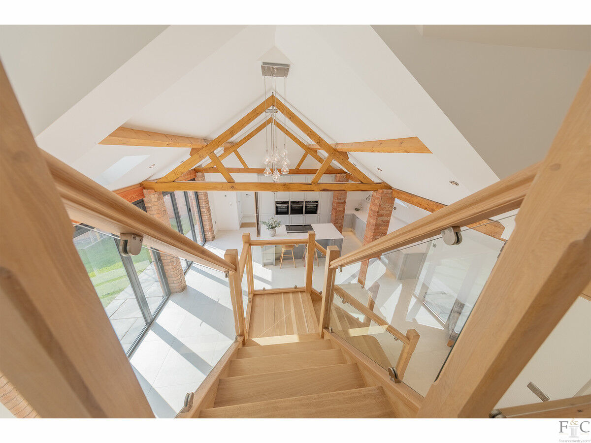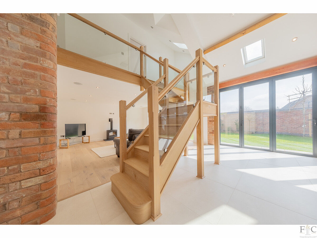 The contemporary living area opens up through double doors from the entrance hall. This generous space has distinctive zones and in a central position, a beautifully designed oak and glass panelled carpeted staircase ascends to a galleried landing. It is flooded with light emitting from bi-folding doors, windows and sky lights. A vaulted ceiling with exposed brick pillars adds to the feeling of extensive space and draws attention to the beams and shape of the barn roof above.