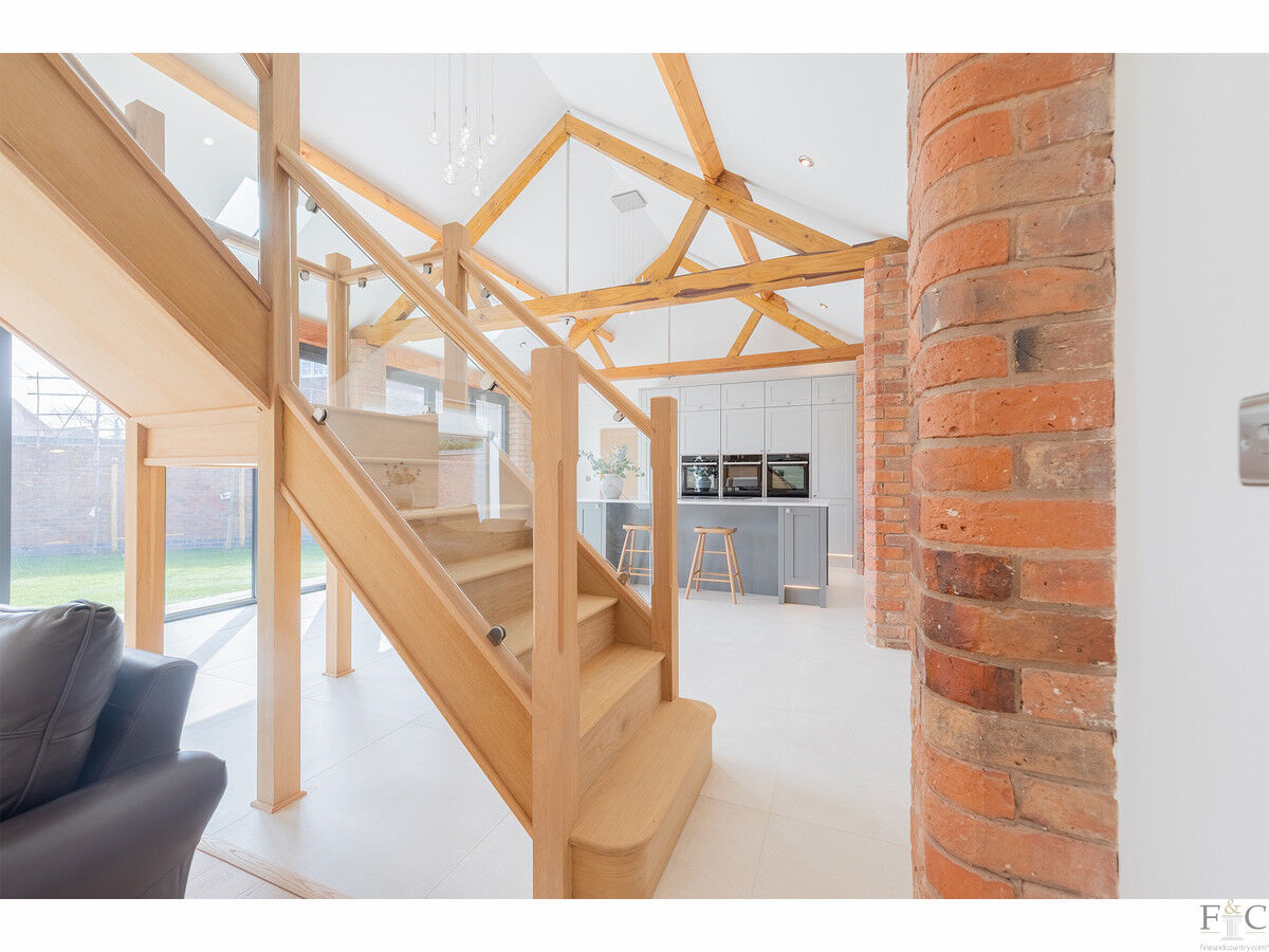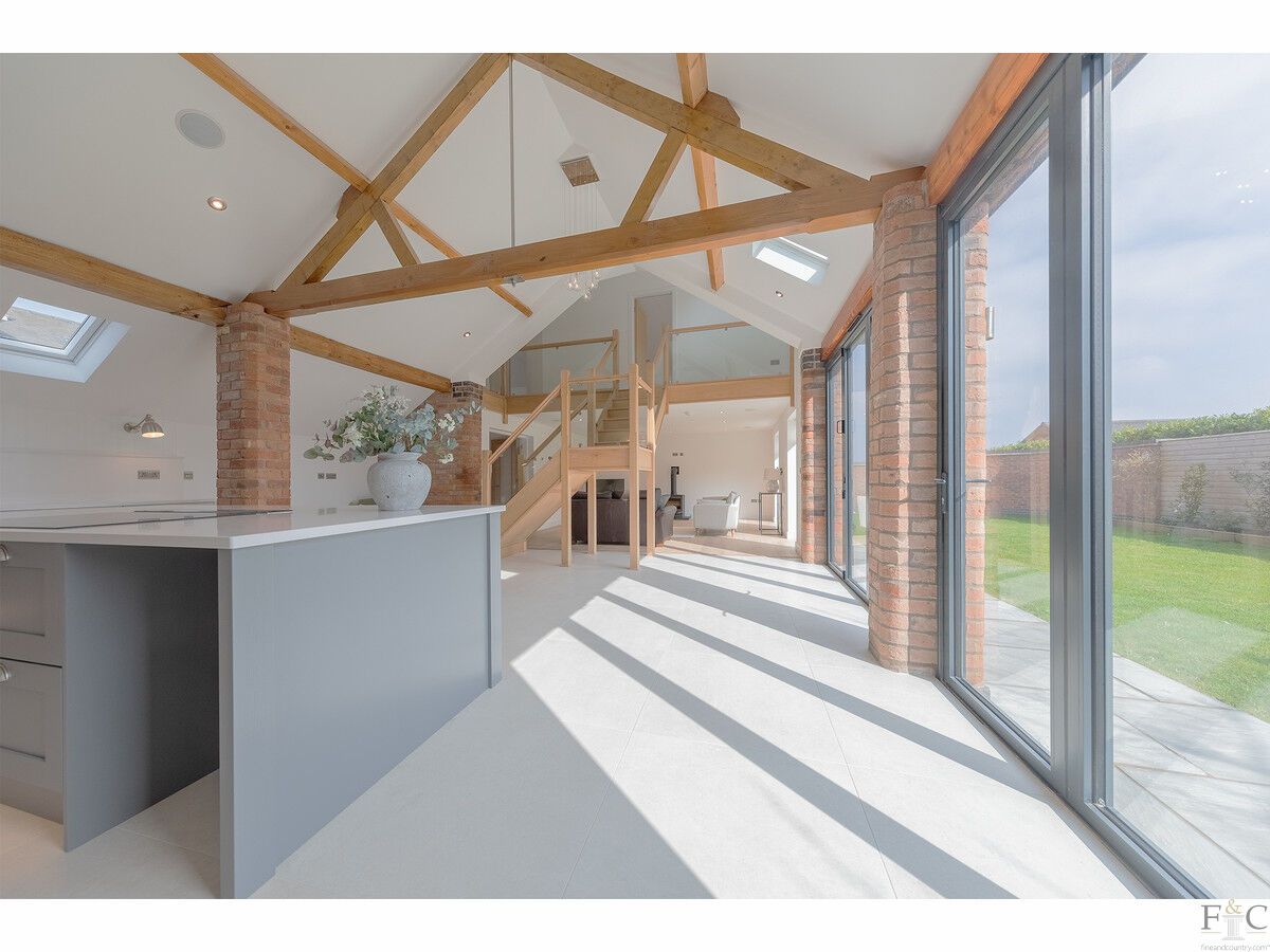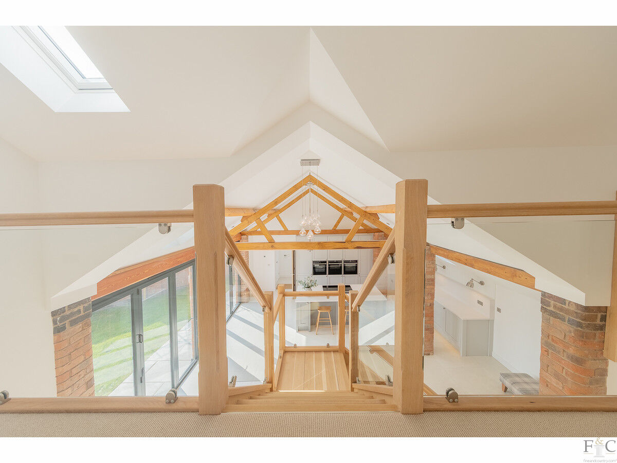 The contemporary living area opens up through double doors from the entrance hall. This generous space has distinctive zones and in a central position, a beautifully designed oak and glass panelled carpeted staircase ascends to a galleried landing. It is flooded with light emitting from bi-folding doors, windows and sky lights. A vaulted ceiling with exposed brick pillars adds to the feeling of extensive space and draws attention to the beams and shape of the barn roof above.