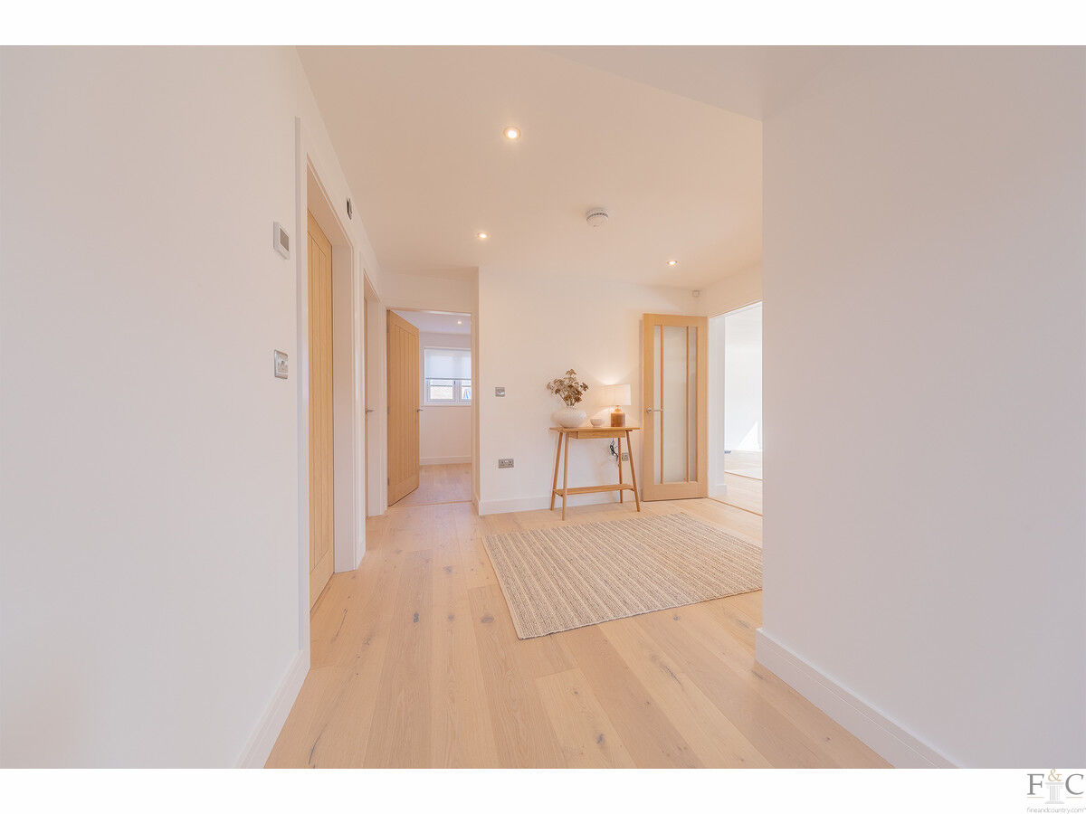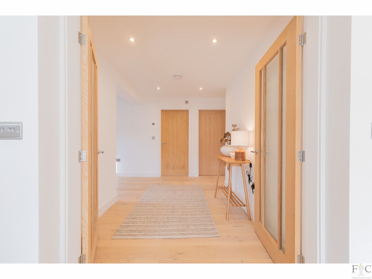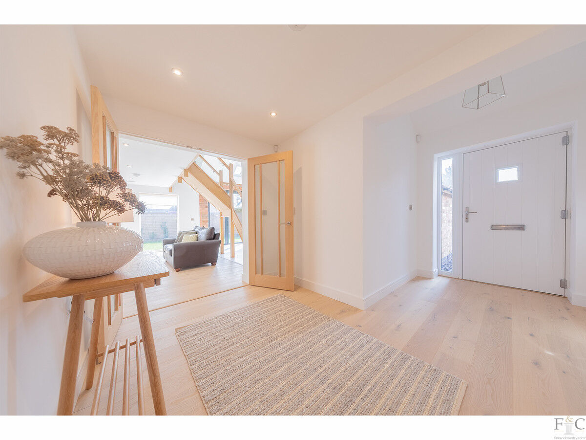 The entrance hall is very welcoming and sets the high standard for interior decoration throughout the property: hard flooring, plainly painted walls and medium oak framed doors. There is an intrinsic simplicity and beauty in the choice of textures, fixtures and fittings throughout this generous home that clearly speaks of minimalism, great planning and decisions made with high quality as standard.