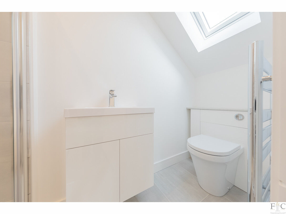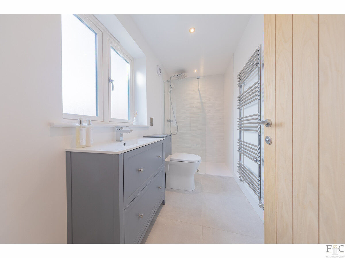 The shower room is contemporary, beautifully maintained and fitted with white goods to a high standard. Tiled in white, it has a walk in shower with toilet, heated towel rail and mirror. This is one of three bathing facilities within Hackney Barn and like the two ensuites on the first floor, are all presented to a high standard and with quality fixtures.