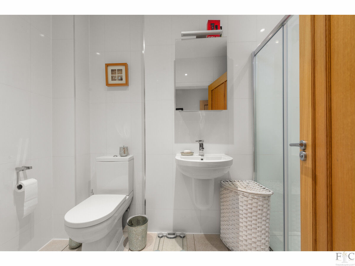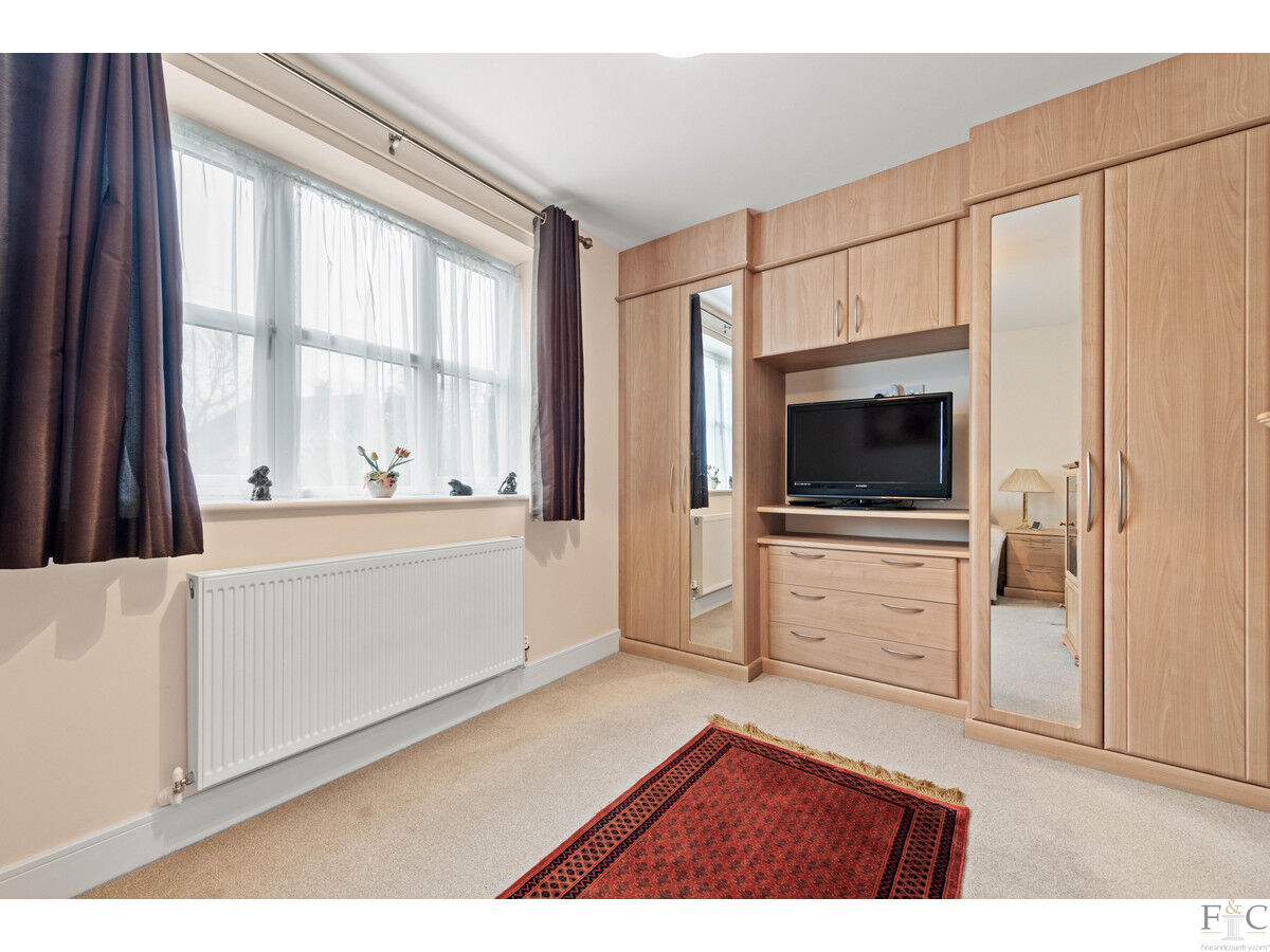 The study, complete with integrated desk and storage, is the next room and also has views into the rear garden. It is immediately next door to the cloakroom, fitted with a white toilet and basin.