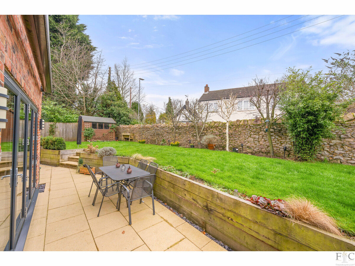 The private garden features dry stone walling and a raised lawn, retained by wooden sleepers bordering the patio. A garden shed provides storage. There are different types of trees, shrubs and plants to enjoy in this child friendly, secluded space.