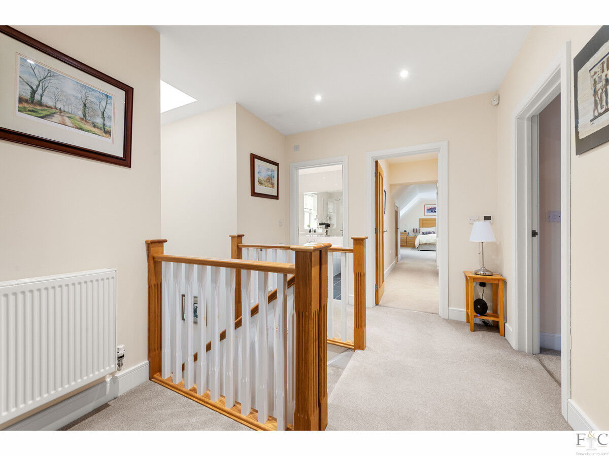 If we now double back through the kitchen and re-enter the hall, the carpeted staircase turns up and round, back into the centre of the house and a large landing exposes the arrangement of doors leading to a family bathroom, four bedrooms and two en-suites.