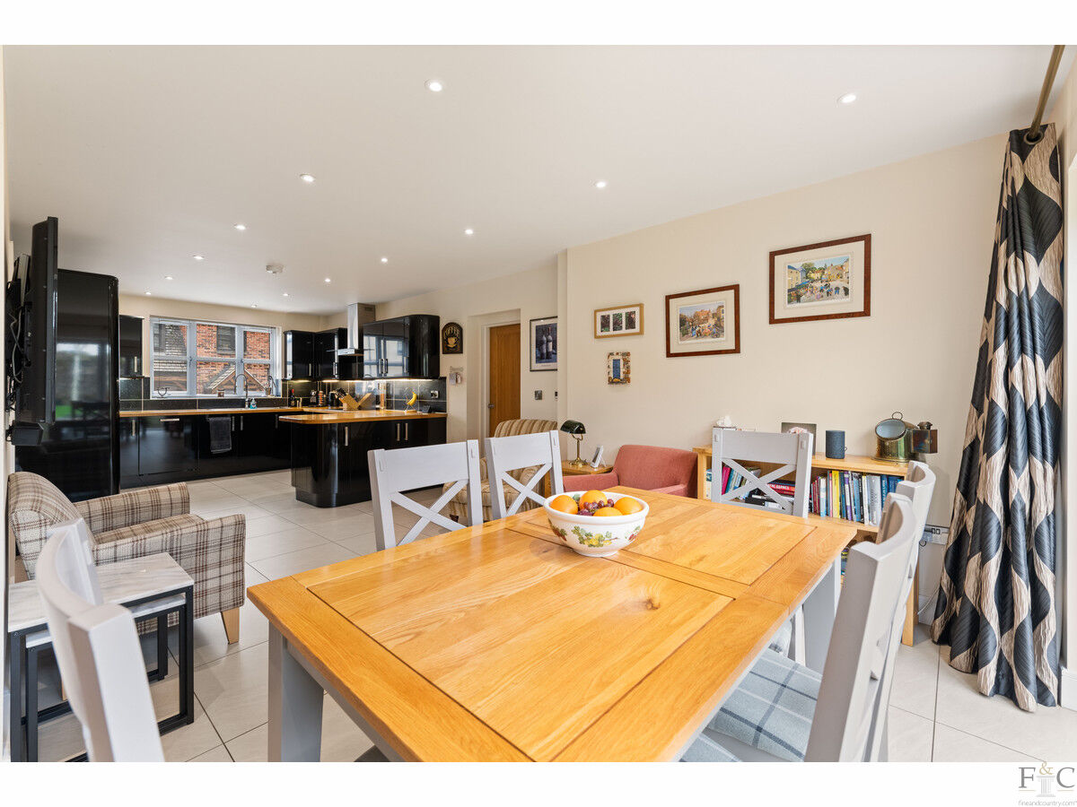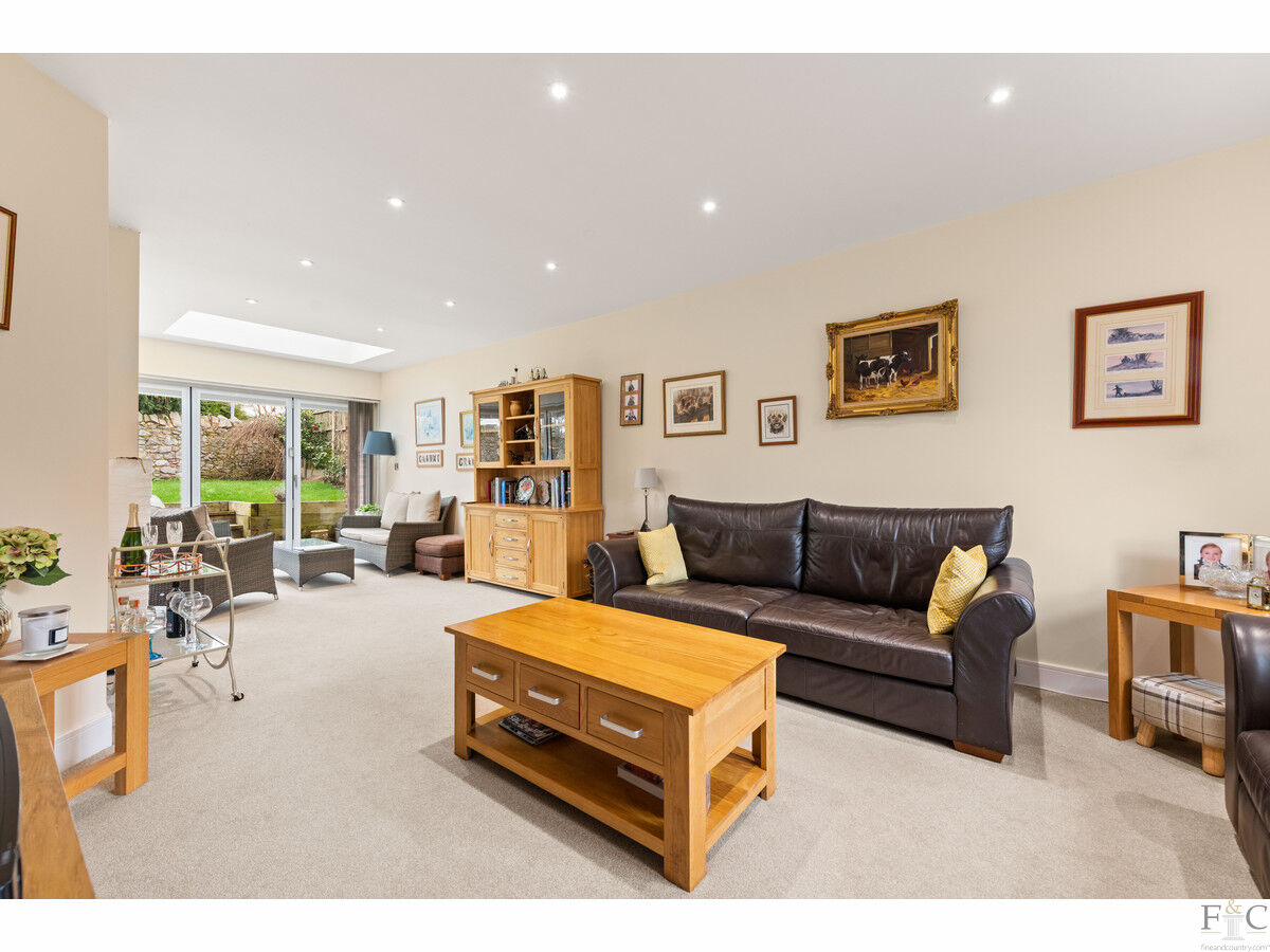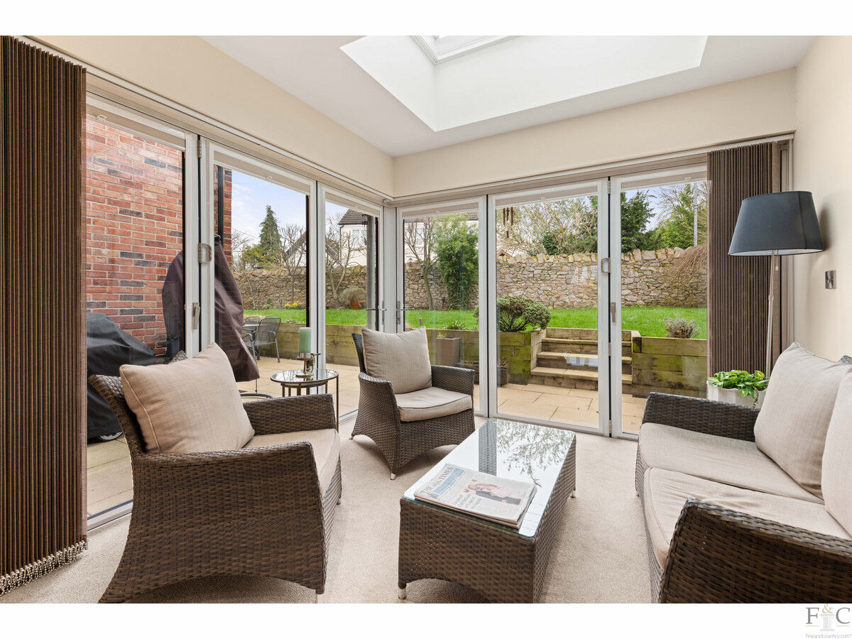 The impressive lounge has been designed to maximise the amount of light to flood into the room: here there are triple aspect windows that look to the front, back and above. This room spans the depth of the house and presents the owner with multiple ways of arranging furniture to sub divide its purpose or simply keep it openly functional. Double sets of bi-folding doors at the furthest end open onto the patio and raised garden, where a pitched skylight provides the third aspect and creates a perfect seating area to enjoy views of the garden in all weathers.