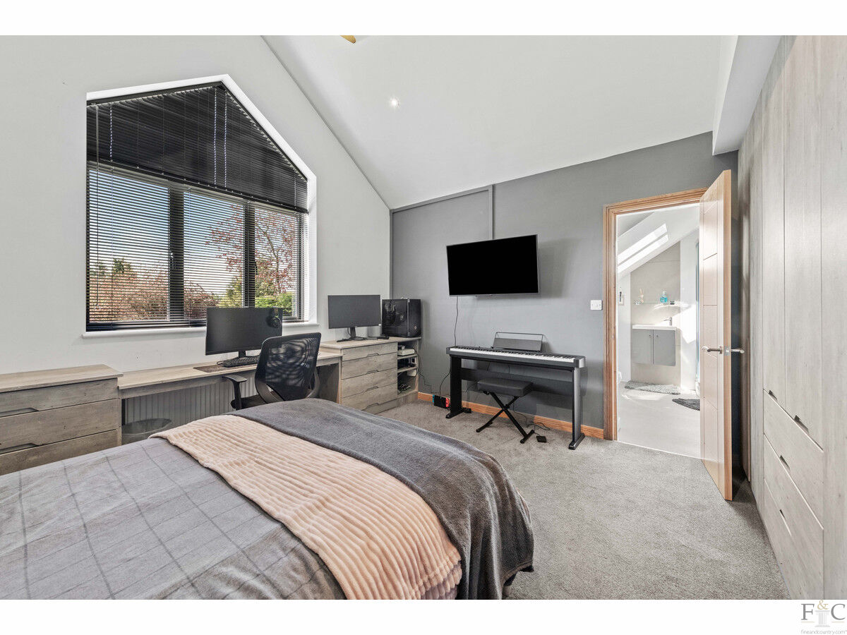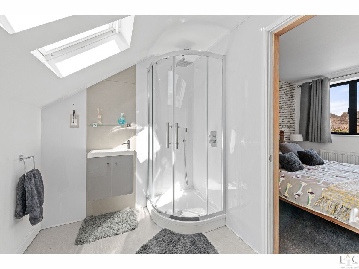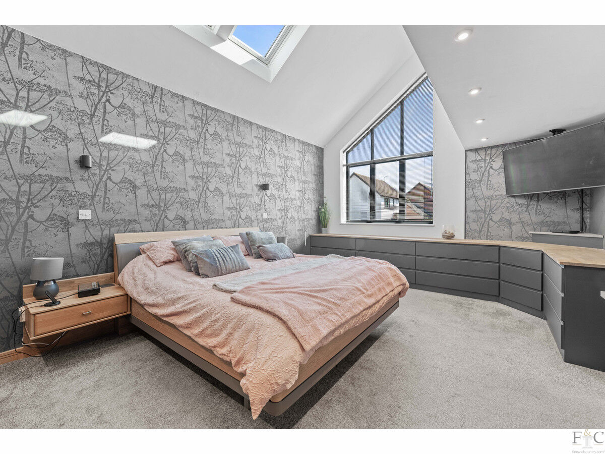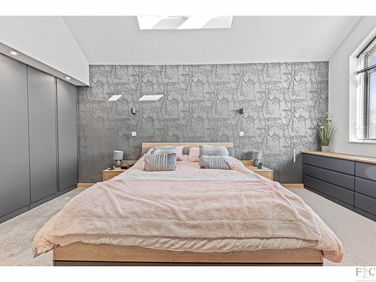 The spacious, master bedroom has a dramatic apex window and skylights. Beautifully fitted wardrobes cover an entire wall and have been coordinated with drawer units and dressing table, featuring a backlit mirror. It is a very glamourous space and is equally complimented with an en-suite consisting of a dual basin unit, walk in shower, heated towel rail and toilet.