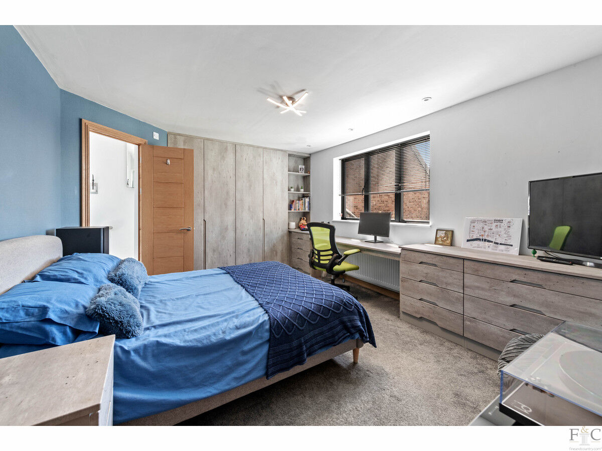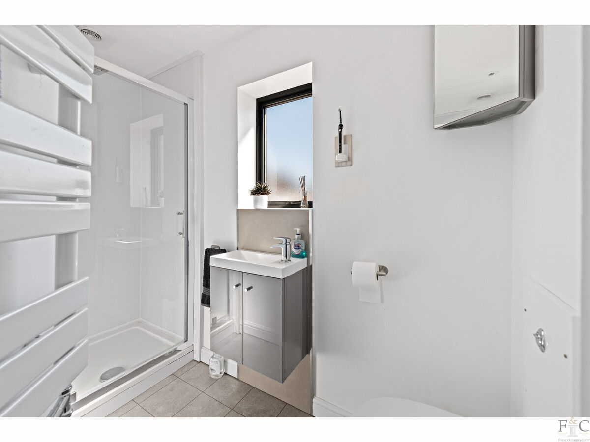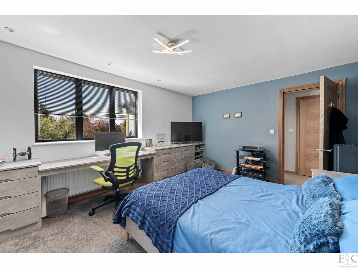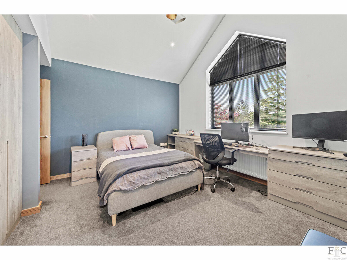 The spacious, master bedroom has a dramatic apex window and skylights. Beautifully fitted wardrobes cover an entire wall and have been coordinated with drawer units and dressing table, featuring a backlit mirror. It is a very glamourous space and is equally complimented with an en-suite consisting of a dual basin unit, walk in shower, heated towel rail and toilet.