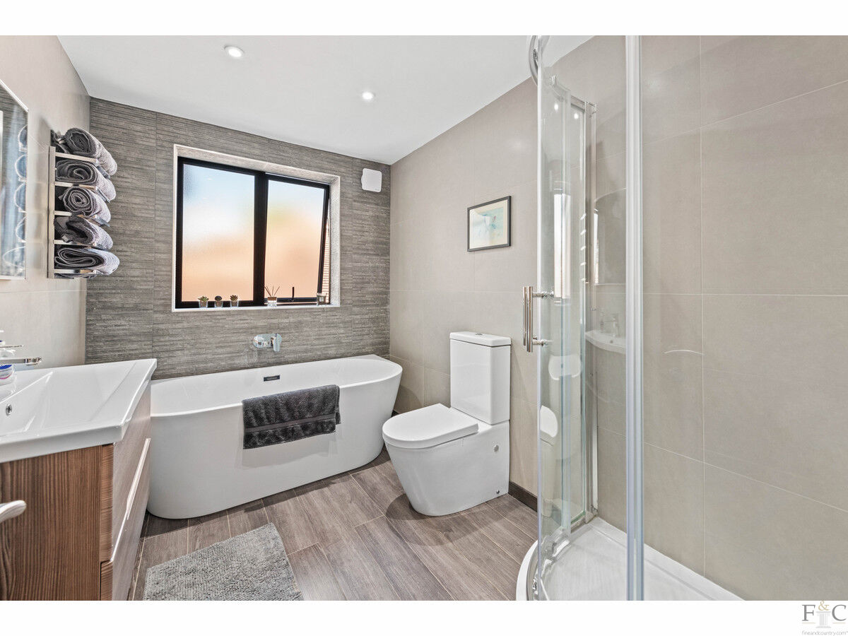A family bathroom is next door to the prime bedroom, comprising of basin, bath, walk in shower, heated towel rail and toilet. Across the landing and above the lounge, a large second bedroom has fitted wardrobes, bedroom storage and an en-suite. Bedrooms three and four have a Jack and Jill arrangement of doors opening into an en-suite of their own.