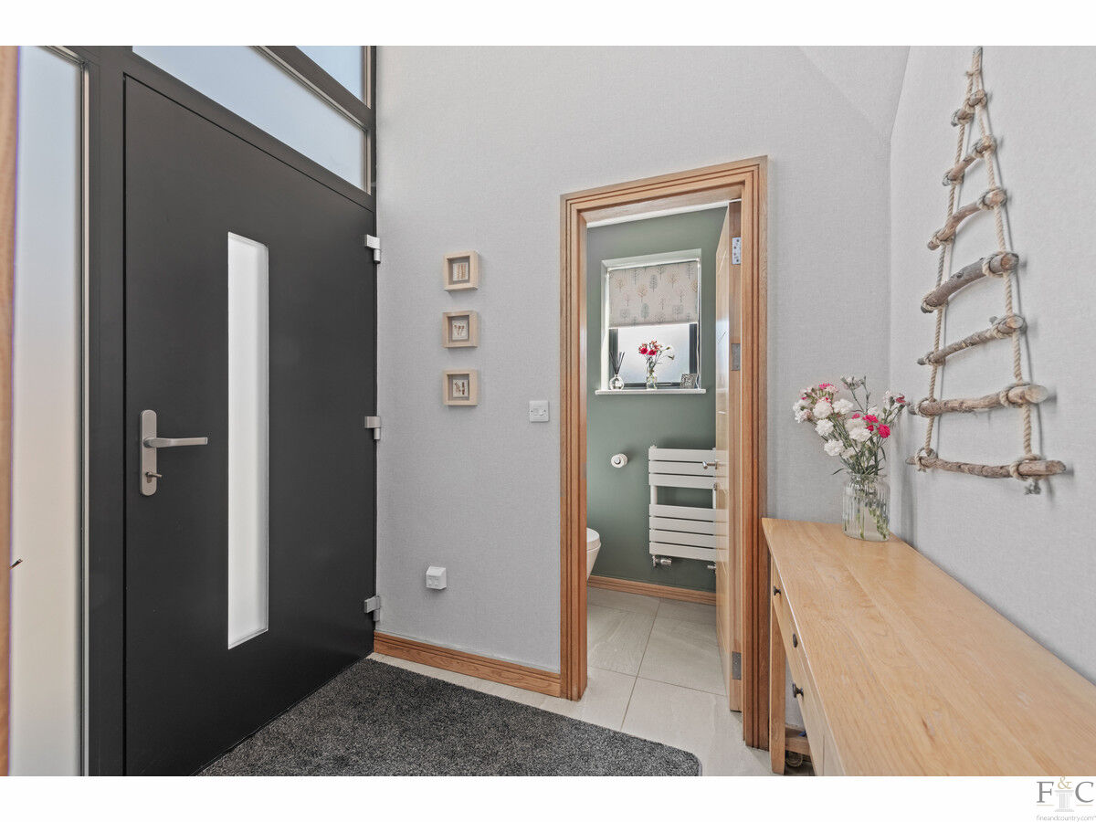 On entry into the house the entrance hall floor is tiled and provides the linking space leading to different rooms. The first door after entry on the left is the downstairs cloakroom, comprising of a two piece suite of hand basin and toilet, with heated towel rail. Immediately in front of the entrance, double oak doors lead into the lounge and then further down the hall, the kitchen/dining room and lastly, the study. Bespoke fitted cupboard and drawer space under the stairs provides practical storage.