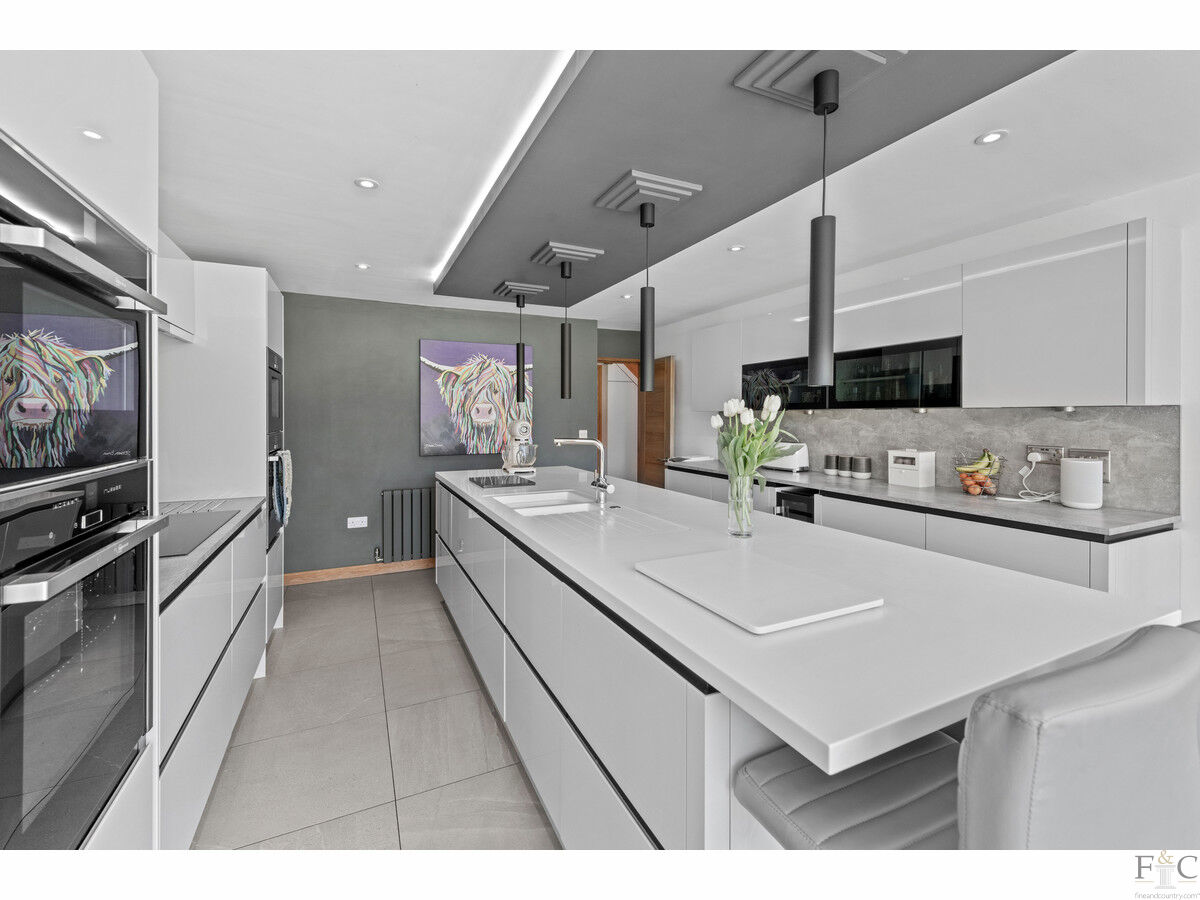 The kitchen island has a Corian worktop with a fitted sink and features four contemporary low level pendant light fixtures. This kitchen has a generous flow of worktops beneath and above white sleek cabinetry, providing a handleless, modernised storage system with soft close function. Integrated appliances by Neff include an induction hob with extractor hood, two single ovens, microwave and coffee machine. Two single fridges, the wine cooler and Hotpoint dishwasher are also integral.