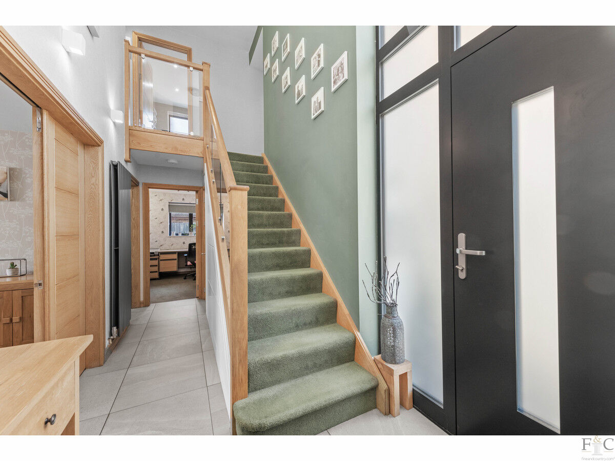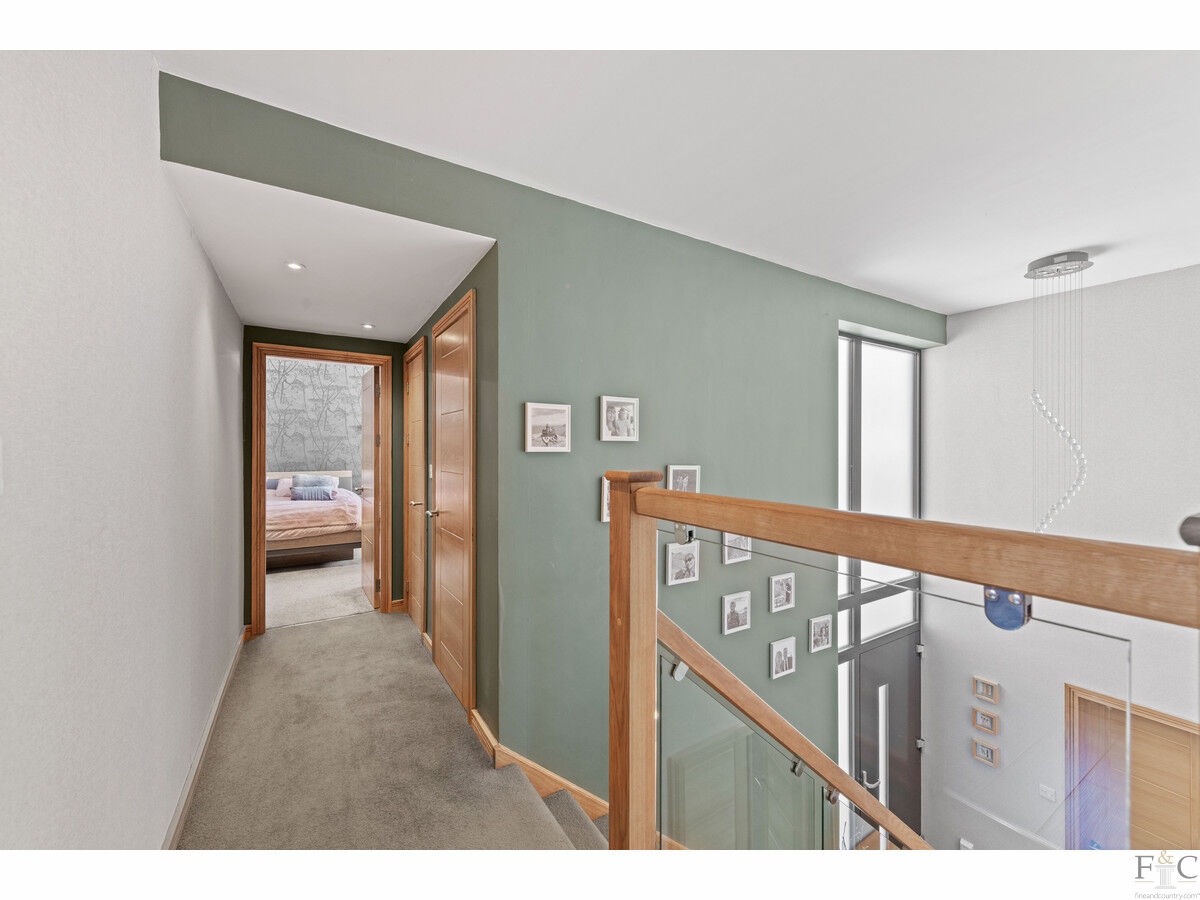 If we now double back through the kitchen, re-enter the hall and travel upstairs, the landing provides access to the rooms on the first and second level. Standing to admire the architectural merits of the windows and open space afforded by the staircase, we can access the primary bedroom suite.