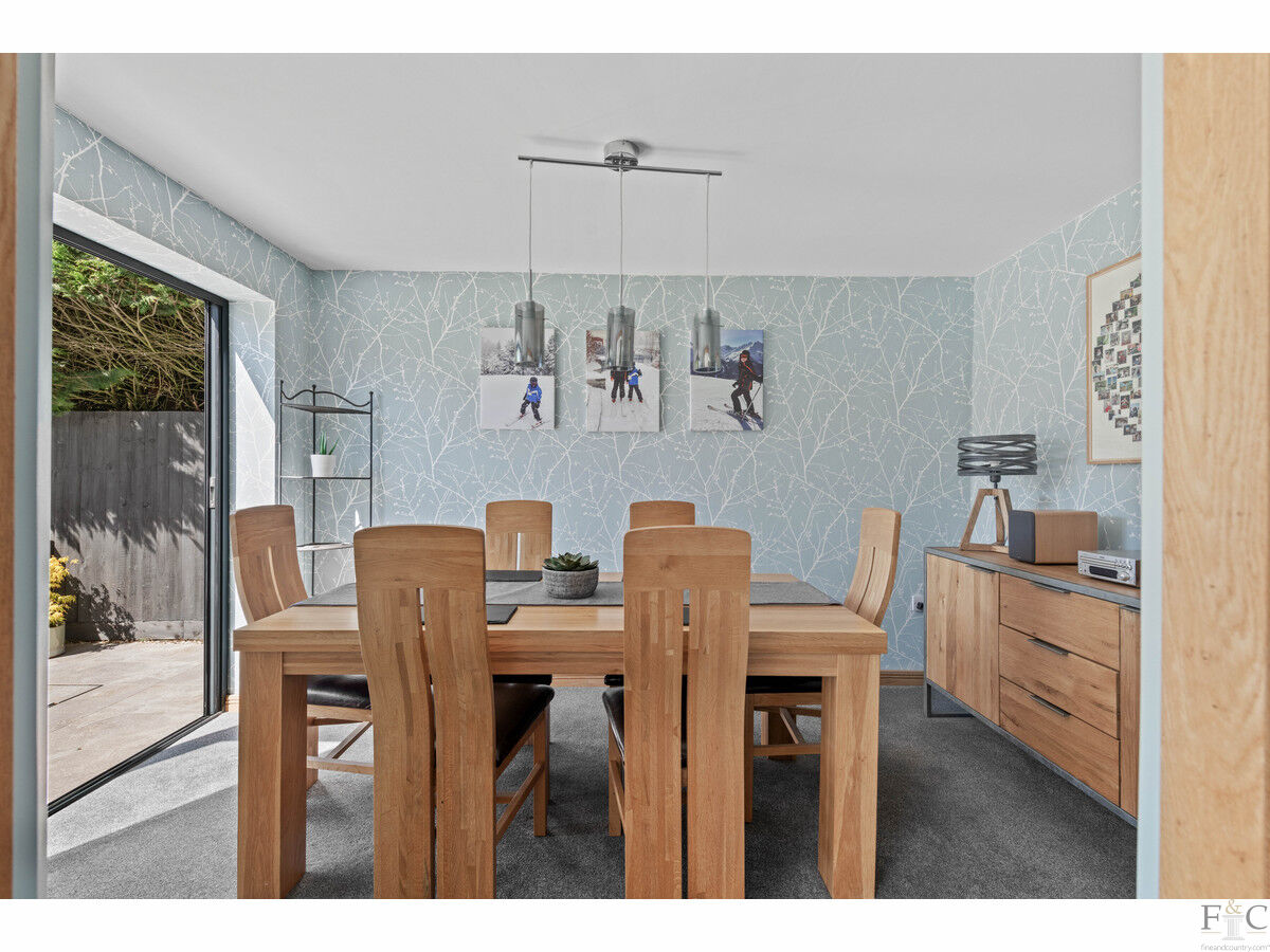Within the kitchen there is ample room to have a table for informal dining or use the independent island counter with high rise chairs. Presently, sofas and a coffee table make good use of this fantastic relaxing space, bathed in natural light. The dining room provides the third option and this lovely room overlooks the south facing garden, while still being within conversational reach of those busy in the kitchen.