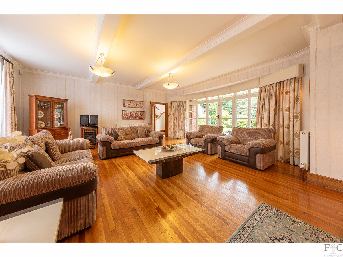 - Large formal reception room with wood flooring and garden access.
