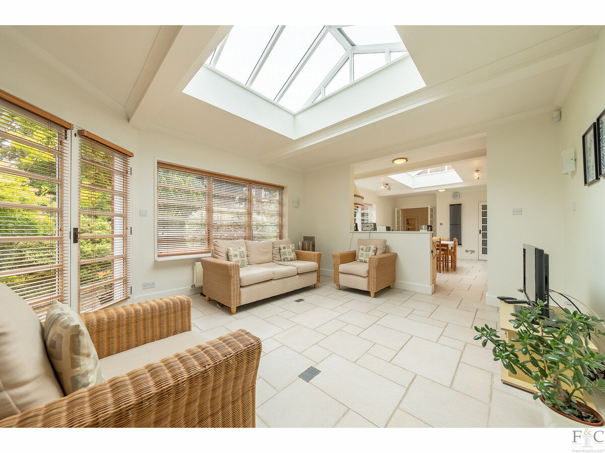 The formal dining room, featuring fitted curved cabinetry and a door leading to the patio rear garden, exudes timeless elegance. It seamlessly connects to the large extended kitchen diner and sunroom. The kitchen, equipped with a Rangemaster and modern appliances, showcases tiled flooring, a skylight, and a large window overlooking the serene garden. Adjacent to the kitchen, the sunroom, with its skylight and access to the rear garden, creates a bright and inviting space, perfect for casual dining or relaxation. There is also a door to the drive and a door to a good-sized fitted utility/laundry room, adding to the kitchen's functionality. An additional toilet in the sunroom adds a touch of convenience.